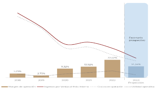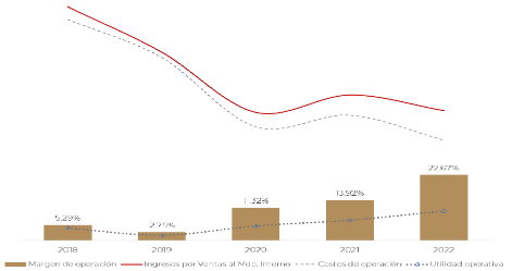 147. La Secretaría observó que, en el periodo de examen y de la revisión de oficio, la rama de producción nacional registró una disminución del 17% en los ingresos por ventas en el mercado nacional, combinado con una disminución del 26% de los costos operativos, lo que resultó en un avance del resultado operativo del 35% y del margen de operación de 8.8 puntos porcentuales. Mientras tanto, durante el periodo analizado, los ingresos por ventas de la mercancía similar en el mercado nacional disminuyeron 55%, en tanto los costos de operación disminuyeron 63%, por lo que el resultado operativo mejoró 94%, y el margen de operación registró una mejora de 17.4 puntos porcentuales, cambiando del 5.3% en 2018 al 22.7% en el periodo de examen y de la revisión de oficio. Lo anterior, puede observarse en la siguiente gráfica.