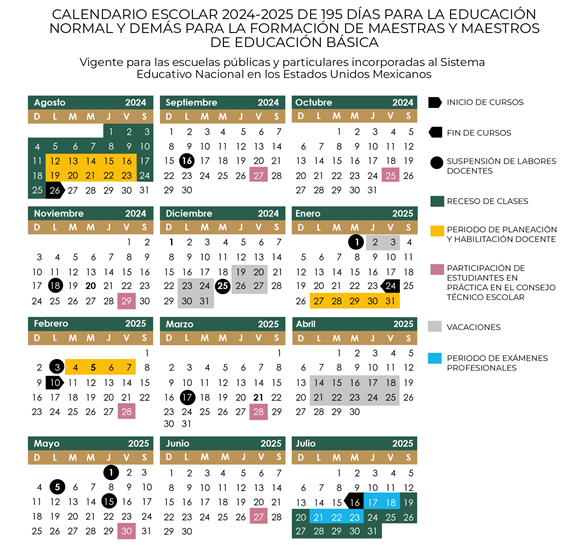 ARTÍCULO SEGUNDO.- Se establece el calendario escolar de ciento noventa y cinco días para el ciclo lectivo 2024-2025, aplicable en toda la República para las escuelas de educación normal y demás para la formación de maestras y maestros de educación básica, públicas y particulares incorporadas al Sistema Educativo Nacional.