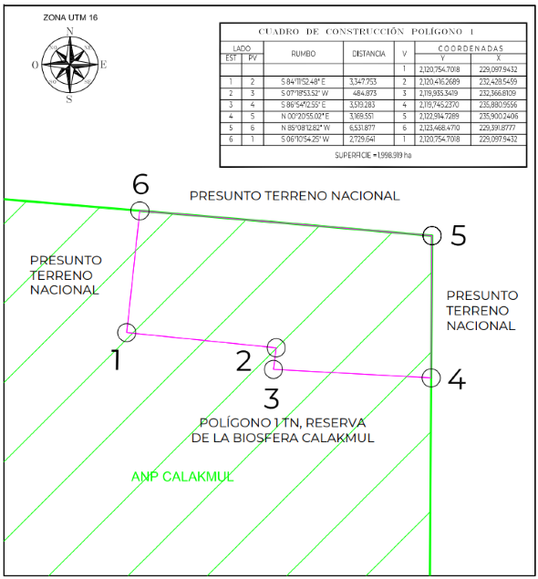Es por ello, que la Secretaría de Medio Ambiente y Recursos Naturales por conducto de la Comisión Nacional de Áreas Naturales Protegidas, mediante oficio No. DGOR/0501/2023 del 28 de abril de 2023, solicitó a la SEDATU la puesta a disposición del "Polígono 1", presunto terreno nacional localizado al interior de la Reserva de la Biosfera de Calakmul, autorizando mediante oficio No.II210.DGOPR.DTN.08301.2024 del 26 de abril de 2024, los trabajos de medición y deslinde del predio citado, con una superficie aproximada de 1,998.919 hectáreas, ubicado en el municipio de Hopelchén, estado de Campeche.