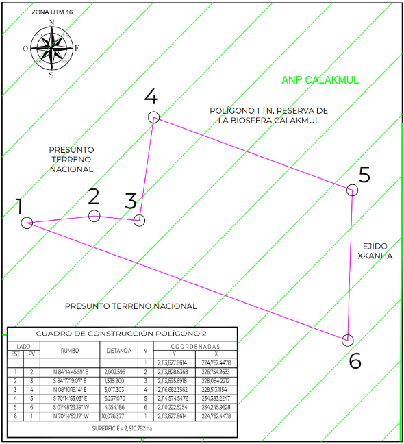 Es por ello, que la Secretaría de Medio Ambiente y Recursos Naturales por conducto de la Comisión Nacional de Áreas Naturales Protegidas, mediante oficio No. DGOR/0501/2023 del 28 de abril de 2023, solicitó a la SEDATU la puesta a disposición del "Polígono 2", presunto terreno nacional localizado al interior de la Reserva de la Biosfera de Calakmul, autorizando mediante oficio No.II210.DGOPR.DTN.08301.2024 del 26 de abril de 2024, los trabajos de medición y deslinde del predio citado, con una superficie aproximada de 2,910.782 hectáreas, ubicado en el municipio de Calakmul, estado de Campeche.