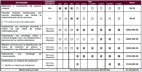 | Implementar una estrategia educativa a través de una mesa de trabajo interinstitucional (grupo focal) para otorgar conocimientos acerca de los efectos de la violencia de género y el respeto a los Derechos Humanos de las mujeres, todo ello bajo una perspectiva de género y lograr así la sensibilización de las y los adolescentes del municipio Oaxaca de Juárez; así como al personal de las instituciones educativas. Estas acciones coadyuvarán en la transformación de patrones culturales que anidan la violencia de género. | 1.- Definir las instituciones de educación básica media superior y superior en las que se implementará el proyecto. 2.- Conformar una mesa de trabajo interinstitucional (grupo focal). 3.-Sensibilizar para promover la igualdad y no discriminación, los derechos humanos de las niñas y mujeres tomando en cuenta la perspectiva de género, a través de talleres y/o conferencias dirigidas al alumnado, profesorado y personal administrativo en los centros educación pública. | 1.-Número de escuelas de aplicación del programa. | 1.- Listado de las escuelas a intervenir firmado por autoridad competente. |