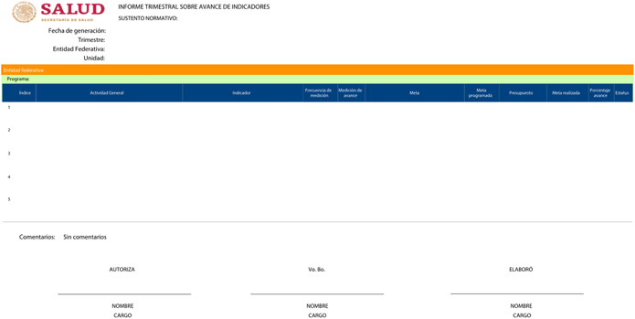 ![]() | SUBSECRETARÍA DE PREVENCIÓN Y PROMOCIÓN DE LA SALUD UA/OAD: PROGRAMA: Ejercicio Fiscal: Entidad Federativa: |