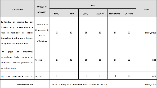 | 1 | Se contactará al personal que participó en la ejecución del proyecto AVGM/CHIS/AC02/SSPC/011 para la recontratación de profesionistas especializados que integrarán los equipos facilitadores de las sesiones de reeducación: 4 Abogadas (os), 3 Psicólogos (as), 1 profesional del área educativa, 1 profesional de educación artística y 1 profesional de educación física para integrar los grupos de reeducación, de los cuales un profesionista contratado fungirá como coordinador del proyecto. Los profesionistas cuentan ya con experiencia en desarrollo de programas reeducativos con perspectiva de género y llevarán a cabo la implementación del programa de reeducación para hombres generadores de violencia, brindando servicios de reeducación a través de sesiones grupales. |