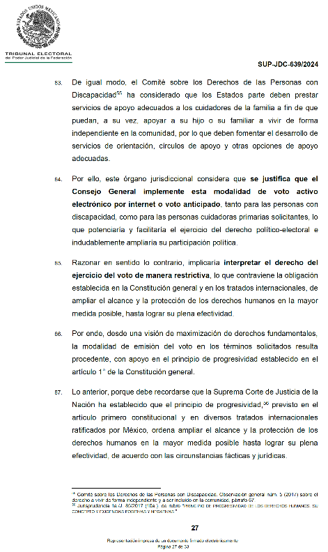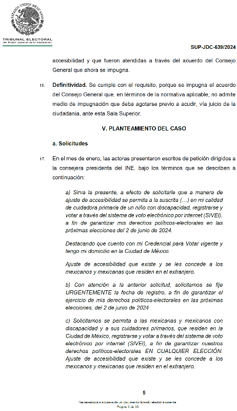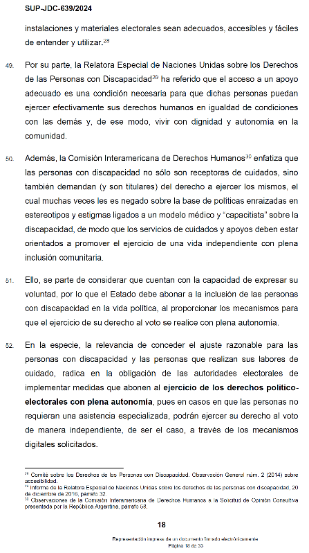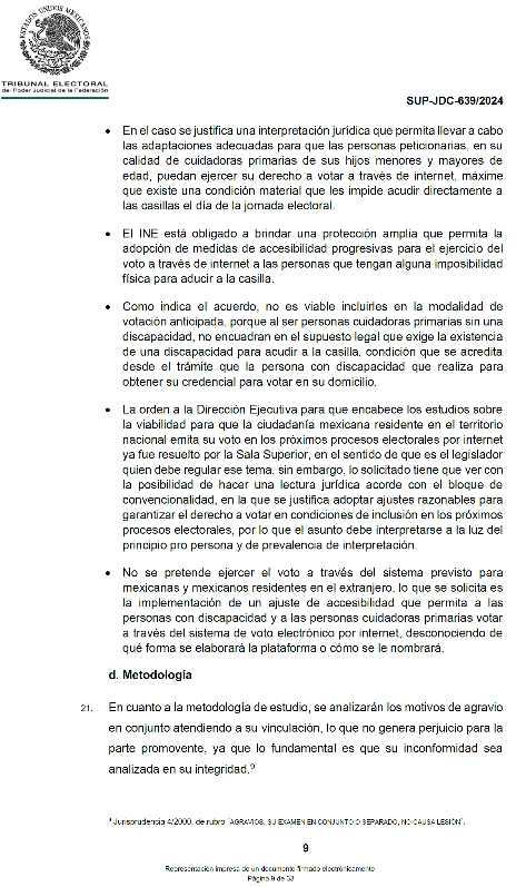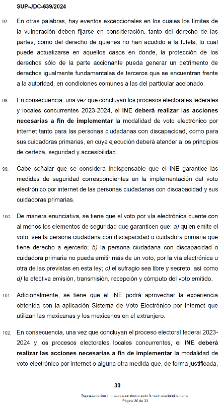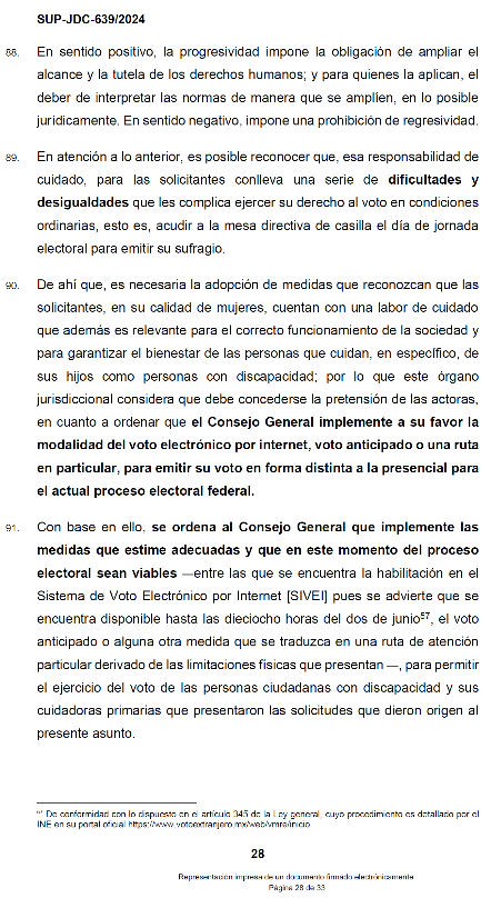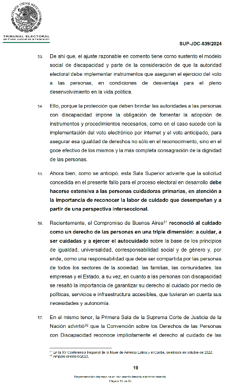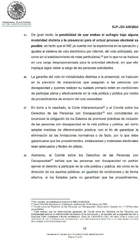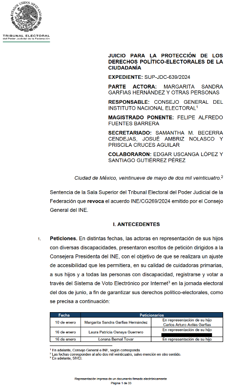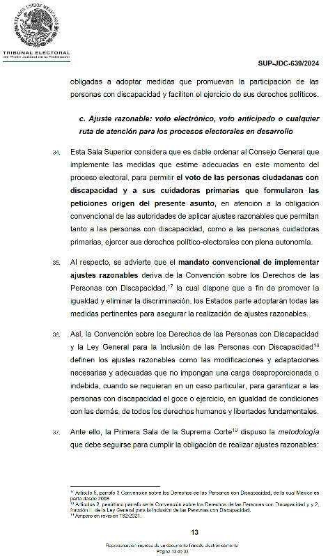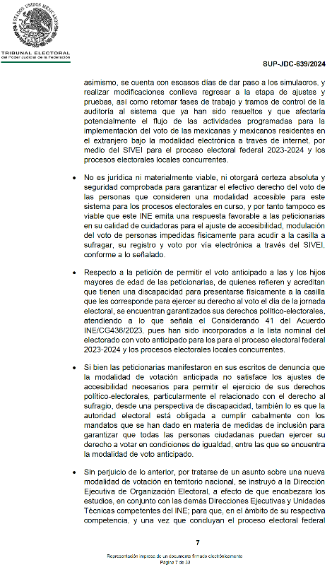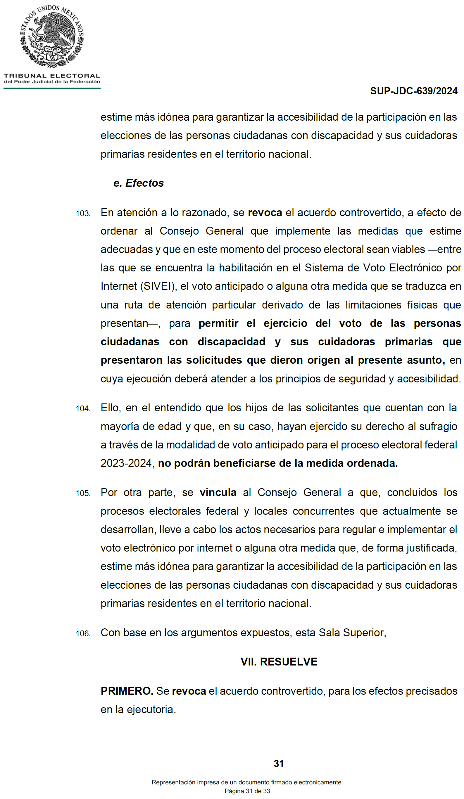 XVII. El 29 de mayo la Sala Superior del TEPJF, dictó sentencia en el expediente SUP-JDC-639/2024, mediante la que revocó el acuerdo INE/CG269/2024 emitido por el Consejo General, y le ordenó implementar las medidas que estime adecuadas y que en este momento del proceso electoral sean viables -entre las que se encuentra la habilitación en el SIVEI, el voto anticipado o alguna otra medida que se traduzca en una ruta de atención particular derivado de las limitaciones físicas que presentan-, para permitir el ejercicio del voto de las personas ciudadanas con discapacidad y sus cuidadoras primarias que presentaron las solicitudes que dieron origen a dicho expediente, en cuya ejecución deberá atender a los principios de seguridad y accesibilidad.