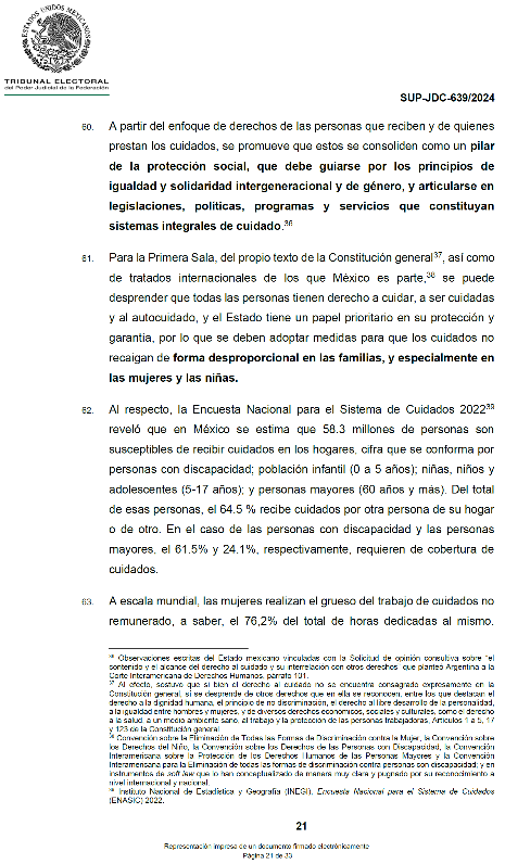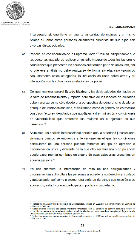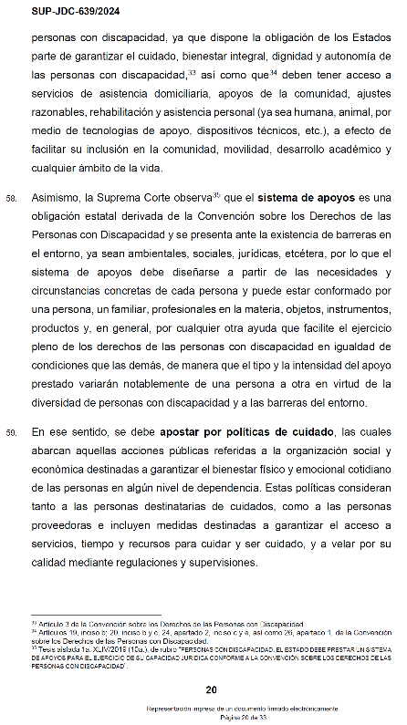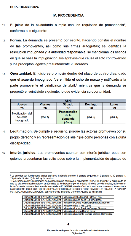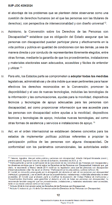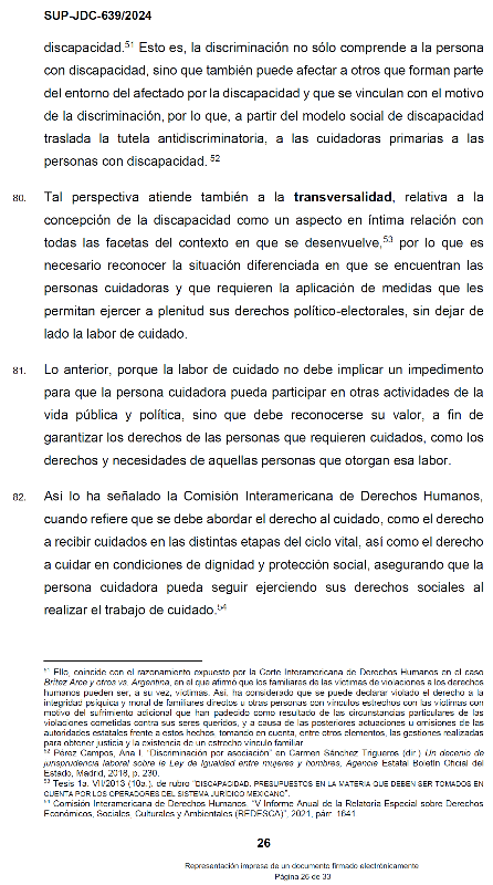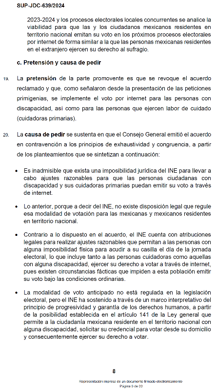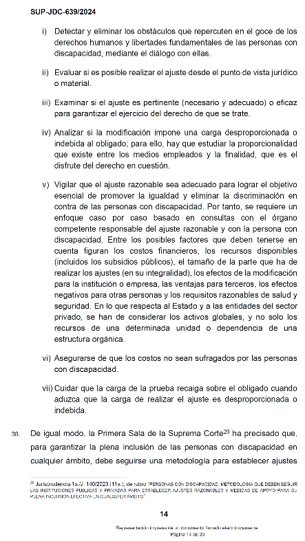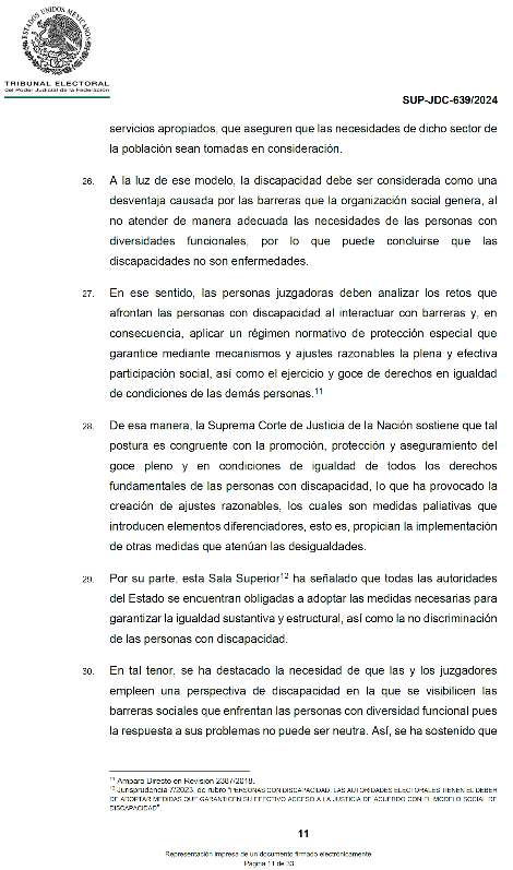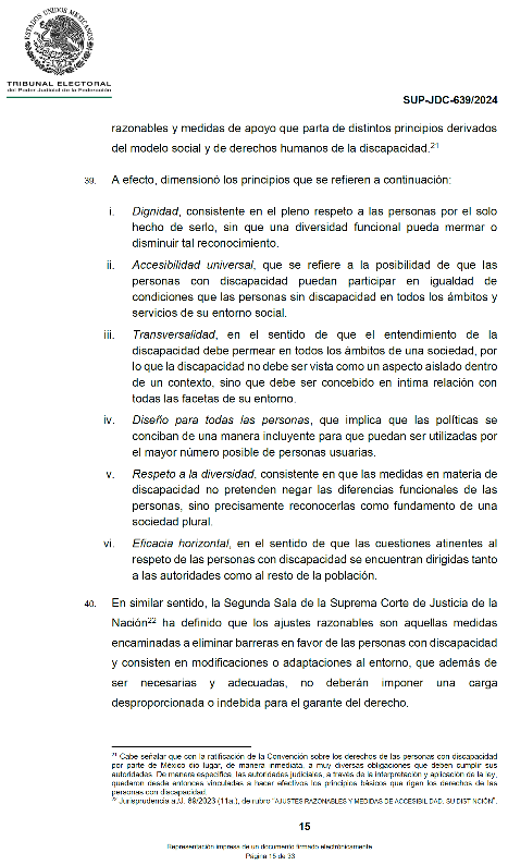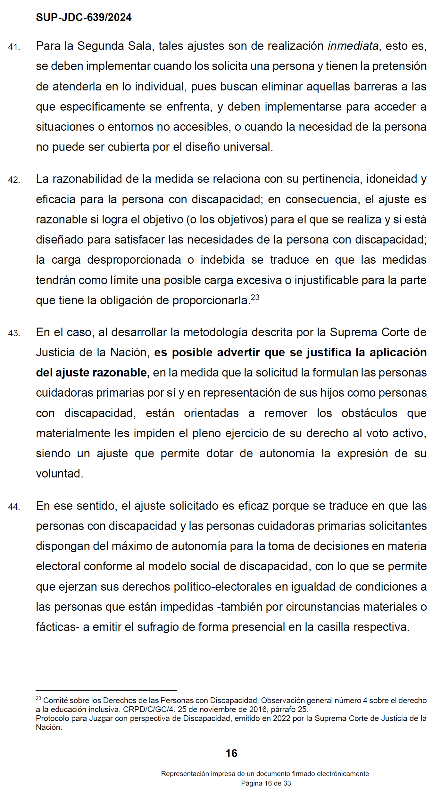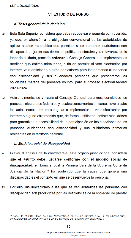 XVII. El 29 de mayo la Sala Superior del TEPJF, dictó sentencia en el expediente SUP-JDC-639/2024, mediante la que revocó el acuerdo INE/CG269/2024 emitido por el Consejo General, y le ordenó implementar las medidas que estime adecuadas y que en este momento del proceso electoral sean viables -entre las que se encuentra la habilitación en el SIVEI, el voto anticipado o alguna otra medida que se traduzca en una ruta de atención particular derivado de las limitaciones físicas que presentan-, para permitir el ejercicio del voto de las personas ciudadanas con discapacidad y sus cuidadoras primarias que presentaron las solicitudes que dieron origen a dicho expediente, en cuya ejecución deberá atender a los principios de seguridad y accesibilidad.
