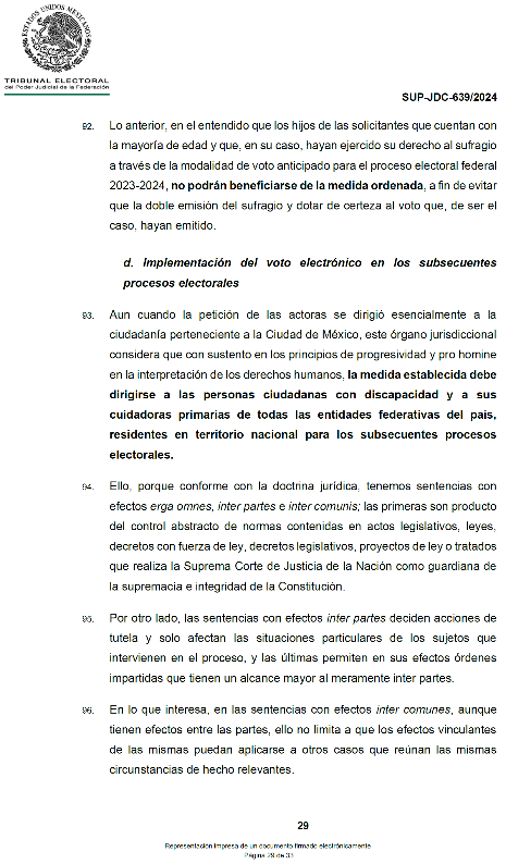 104. Ello, en el entendido que los hijos de las solicitantes que cuentan con la mayoría de edad y que, en su caso, hayan ejercido su derecho al sufragio a través de la modalidad de voto anticipado para el proceso electoral federal 2023-2024, no podrán beneficiarse de la medida ordenada.
