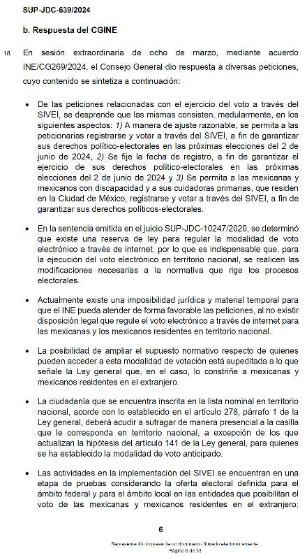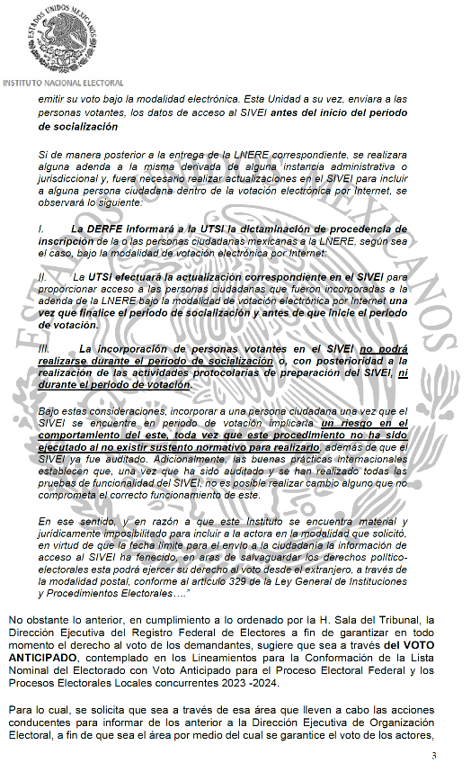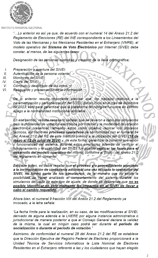 "... Lo anterior es así ya que, de acuerdo con el numeral 14 del Anexo 21.2 del Reglamento de Elecciones (RE) del INE correspondiente a los Lineamientos del Voto de las Mexicanas y los Mexicanos Residentes en el Extranjero (VMRE), el modelo operativo del Sistema de Voto Electrónico por Internet (SIVEI) debe constar, al menos, de las siguientes fases: