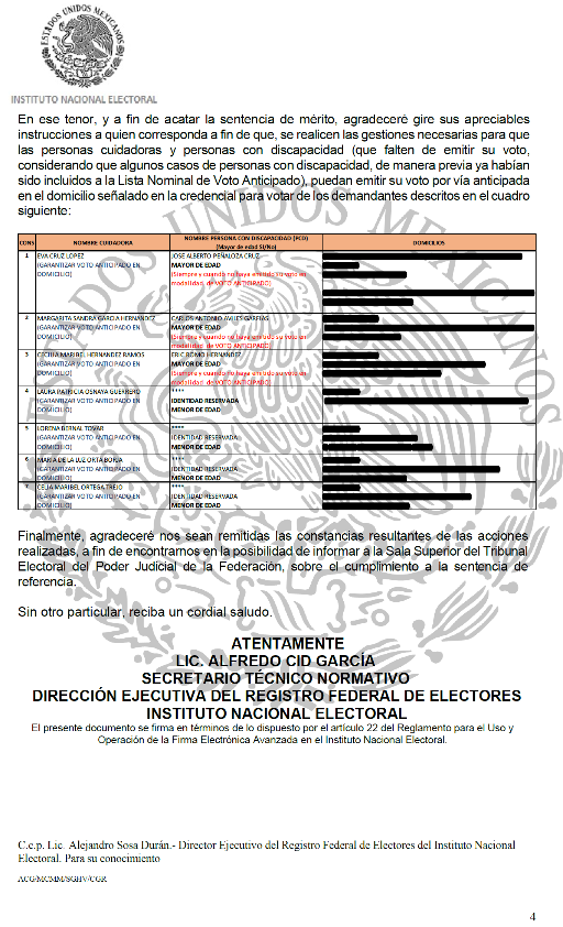 En relación con las personas con discapacidad mayores de edad, después de verificar los datos, en la LNEVA y de conformidad con lo reportado por la Junta Distrital Ejecutiva 22 de la Ciudad de México, la DEOE identificó que José Alberto Peñaloza Cruz ya votó.