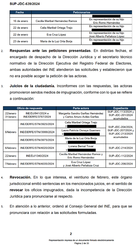 XI. Entre el 26 de enero y 13 de febrero de 2024, las personas ciudadanas referidas en el numeral IX presentaron sus respectivos medios de impugnación ante el TEPJF, con la finalidad de controvertir los oficios emitidos por el Secretario Técnico Normativo de la DERFE, en los que determinó la inviabilidad para que puedan ejercer su voto a través del SIVEI.