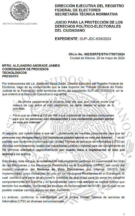 38. La modalidad de voto electrónico conforme a Lineamientos del Voto de las Mexicanas y los Mexicanos Residentes en el Extranjero (VMRE), así como del modelo operativo del SIVEI, fue implementado como modalidad de voto de los Mexicanos Residentes en el Extranjero, lo cual conllevó una serie de acciones y medidas de seguridad para no poner en riesgo el comportamiento del Sistema y su funcionalidad, mismo que también fue auditado, con todas las pruebas de funcionalidad del SIVEI, por lo cual no es posible realizar cambio alguno en este momento; considerando que, la Unidad Técnica de Servicios de Informática ha precisado, que existe una imposibilidad jurídica y material para incluir registros adicionales en modalidad electrónica en materia del voto en el extranjero, en consecuencia dicha imposibilidad también se tiene para implementar las medidas tendientes a habilitar el Sistema de Voto electrónico por Internet (SIVEI), para permitir el ejercicio del voto de las personas ciudadanas con discapacidad y sus cuidadoras primarias que presentaron las solicitudes que dieron origen al presente asunto. En el oficio número INE/DERFE/STN/17507/2024, de fecha 29 de mayo de 2024, dirigido al Coordinador de Procesos Tecnológicos y signado por el Secretario Técnico Normativo de la DERFE, quien señaló que en diversas comunicaciones la Unidad Técnica de Servicios de Informática ha manifestado: