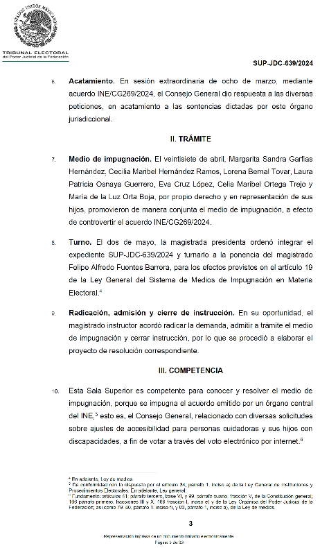 1. De conformidad con lo previsto en los artículos 41, párrafo tercero, Base V, Apartado A, párrafos primero y segundo, y Apartado B, inciso a), numeral 3 de la Constitución; 29; 5, párrafo 2, 32, párrafo 1, inciso a), fracción III; 34, párrafo 1, inciso a); 35; 36; 44, párrafo 1, incisos gg) y jj); 133, párrafo 1 de la LGIPE; 4, párrafo 1, fracción I, apartado A, inciso a); 5, párrafo 1, inciso x) del Reglamento Interior, este Consejo General es competente para dar cumplimiento a la sentencia dictada por la Sala Superior del TEPJF en el expediente SUP-JDC-639/2024.