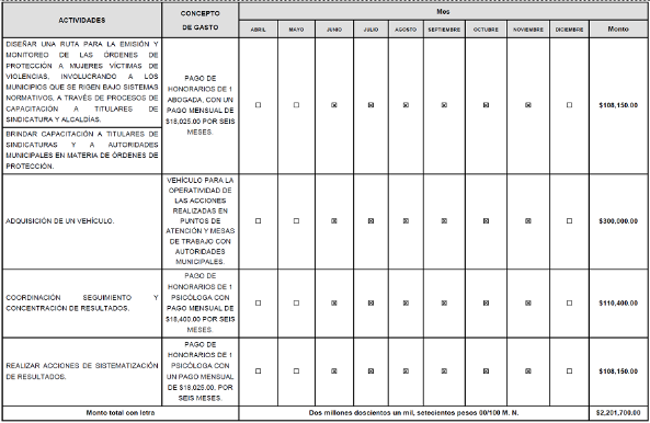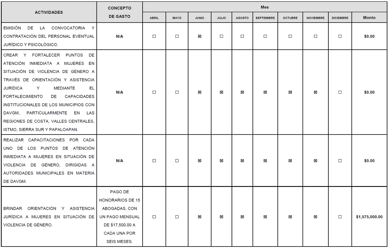 | Integrar un equipo de profesionistas con enfoque de género y de derechos humanos, para brindar atención jurídica y psicológica, a niñas, adolescentes y mujeres en situación de violencia, así como a víctimas indirectas en situación de violencia, especialmente a mujeres que se auto adscriben como indígenas, afromexicanas y/o habitan en los 40 municipios con DAVGM. | Emisión de la convocatoria y contratación del personal eventual, jurídico y psicológico. | Número de personas seleccionadas / Número de contratos suscritos. | Contratos. |