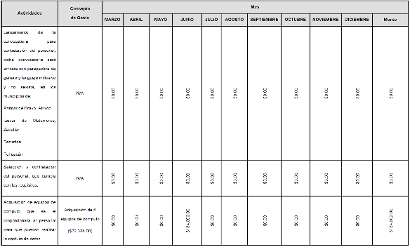 | 1 | Lanzamiento de convocatoria. Se elaborará la convocatoria para el reclutamiento de analistas que habrán de integrarse en el esquema de contrato por servicios profesionales, dicha convocatoria se emitirá con enfoque en perspectiva de género y lenguaje inclusivo y no sexista. La convocatoria será emitida para los municipios de Palmar de Bravo, Atlixco, Izúcar de Matamoros, Zacatlán, Teziutlán y Tehuacán, los cuales serán los municipios sedes, además de que en dichos municipios se encuentran los edificios C2 y están ubicados estratégicamente por todo el territorio poblano. |