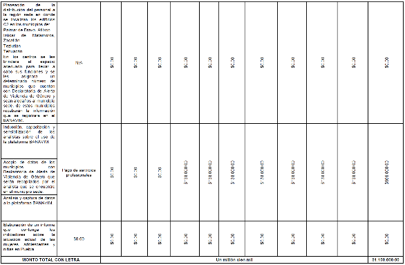 | 1. Integrar profesionistas, capacitados en perspectiva de género y enfoque en derechos humanos, que realicen el correcto análisis y captura de datos al BANAVIM, además de la generación de un registro de datos sobre las Órdenes de Protección que emiten los municipios. | 1.1 Lanzamiento de la convocatoria para contratación del personal, dicha convocatoria será emitida con perspectiva de género y lenguaje inclusivo y no sexista, en los municipios de: Palmar de Bravo, Atlixco Izúcar de Matamoros, Zacatlán Teziutlán Tehuacán 1.2 Selección y contratación del personal, que cumpla con los requisitos. | 1 Convocatoria. 2 Número de analistas contratados. | 1.1 Contrato de los analistas. 1.2 Expediente del personal contratado que contenga: CV Titulo Cedula 1.3 Factura de Bienes Adquiridos. |