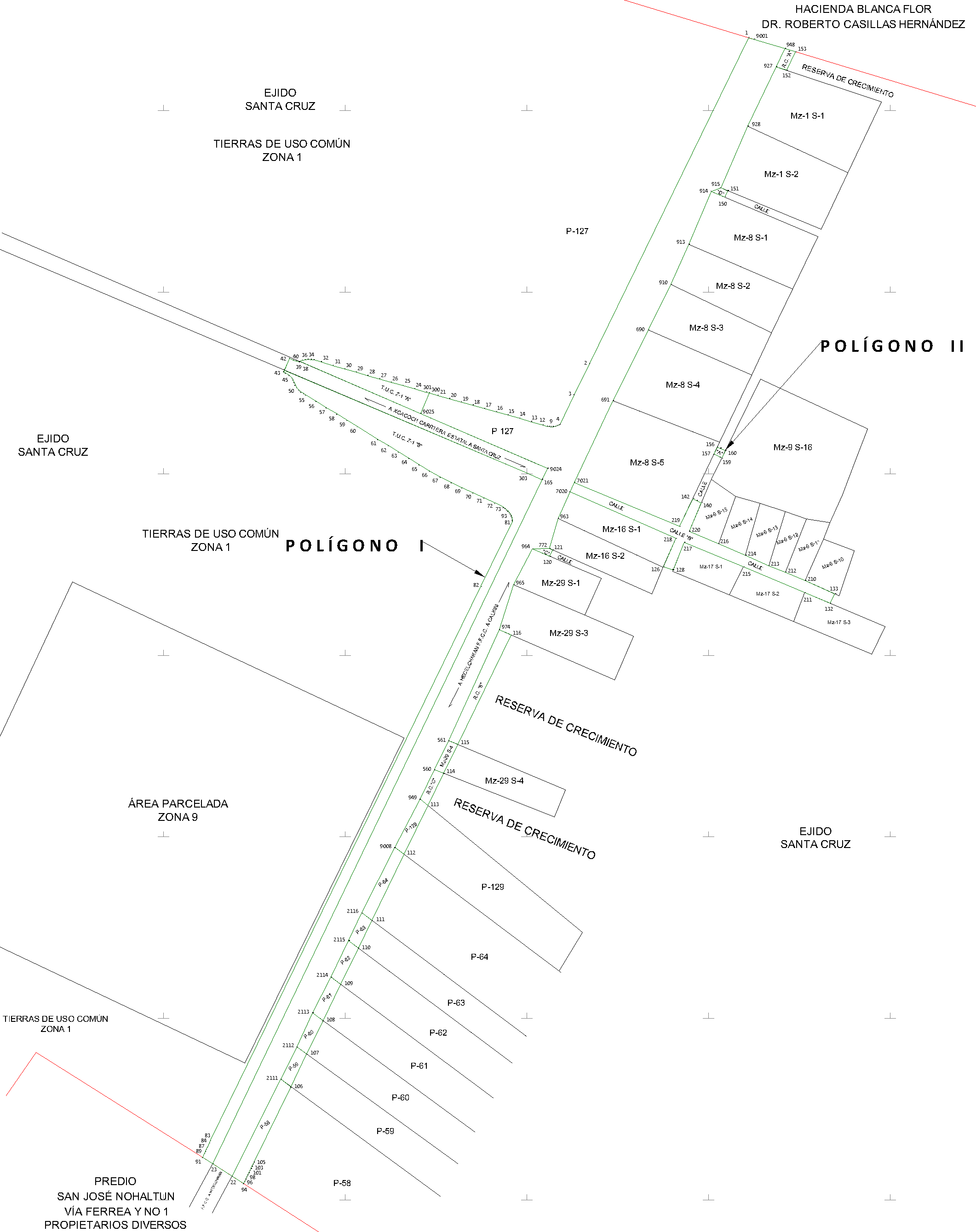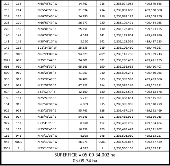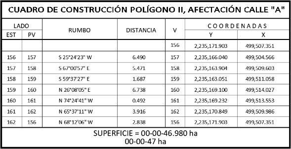 17. Que la Dirección General de Ordenamiento de la Propiedad Rural (DGOPR) de la Sedatu, el 26 de mayo de 2023, emitió acuerdo de instauración del procedimiento de expropiación con número de expediente DGOPR-DE/SOE-04CC/0074FONATUR TREN MAYA, S.A. DE C.V/2023; 18. Que el comisionado técnico del RAN y el comisionado agrario de la Sedatu rindieron el "informe de comisión de Trabajos Técnicos e Informativos de Expropiación", de 7 de agosto de 2023, en el que señalan que la superficie real a expropiar al ejido "Santa Cruz", municipio de Hecelchakán, estado de Campeche es de 05-09-81 ha, de las cuales 04-23-08 ha son de uso común, y 00-86-73 ha son de uso parcelado, que se describen en el siguiente plano y cuadros de construcción: