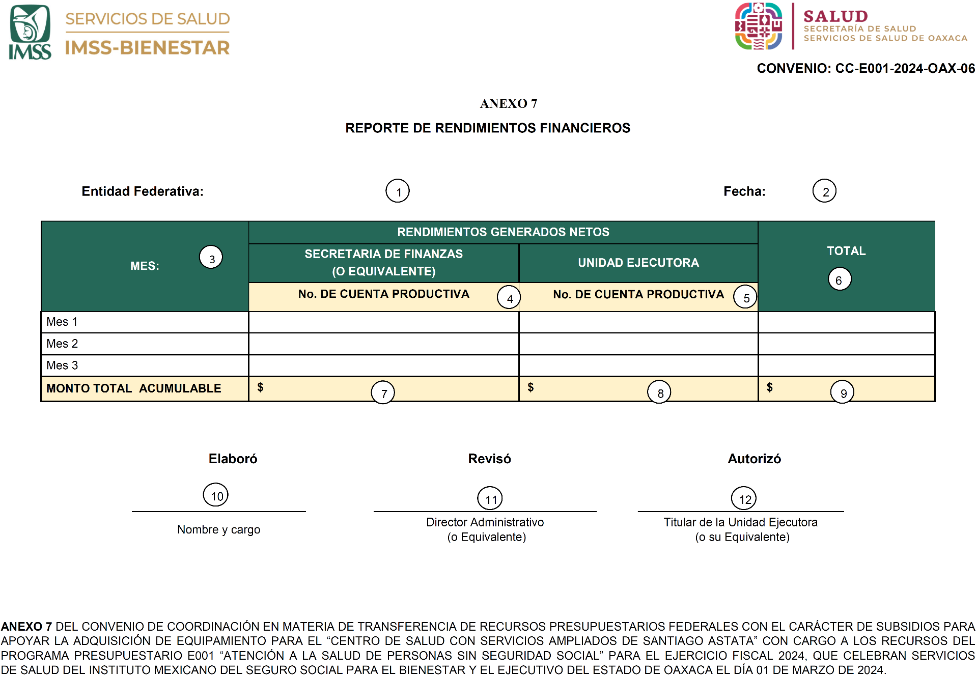 Nota: La Unidad Ejecutora deberá de presentar de manera mensual el registro y control del Formato "Reporte de Rendimientos Financieros" ante el administrador del contrato, acompañado de los estados de cuenta bancarios de la Secretaría de Finanzas (o su equivalente) y de la Unidad Ejecutora.