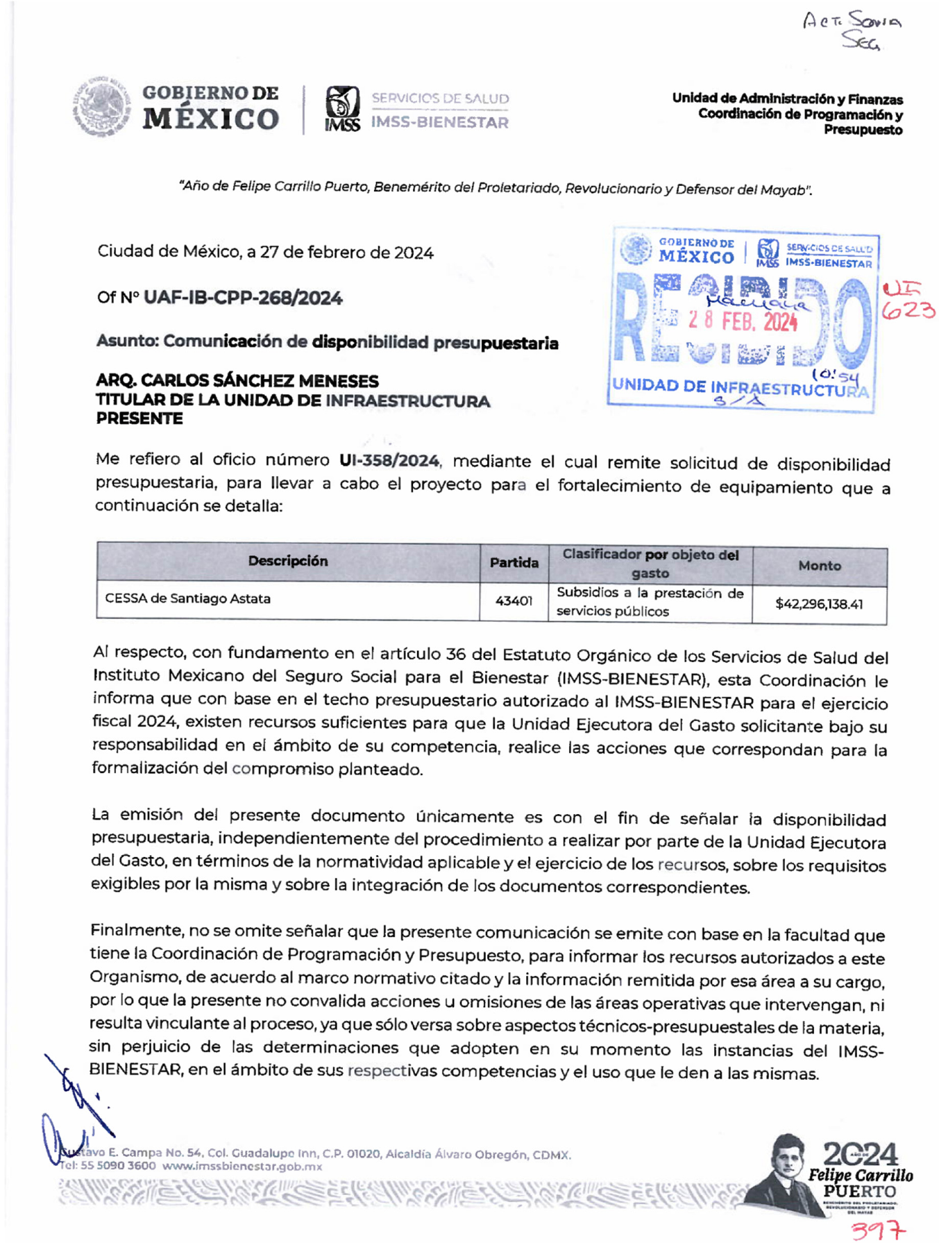 10. Por medio del oficio número UAF-IB-CPP-268/2024, de fecha 27 de febrero de 2024, la Coordinación de Programación y Presupuesto del "IMSS-BIENESTAR" notificó la reserva de recursos hasta por la cantidad de $42,296,138.41 (CUARENTA Y DOS MILLONES DOSCIENTOS NOVENTA Y SEIS MIL CIENTO TREINTA Y OCHO PESOS 41/100 M.N.), con cargo al programa Presupuestario E001, "Atención a la Salud de Personas sin Seguridad Social", oficio que se agrega como ANEXO 1.
