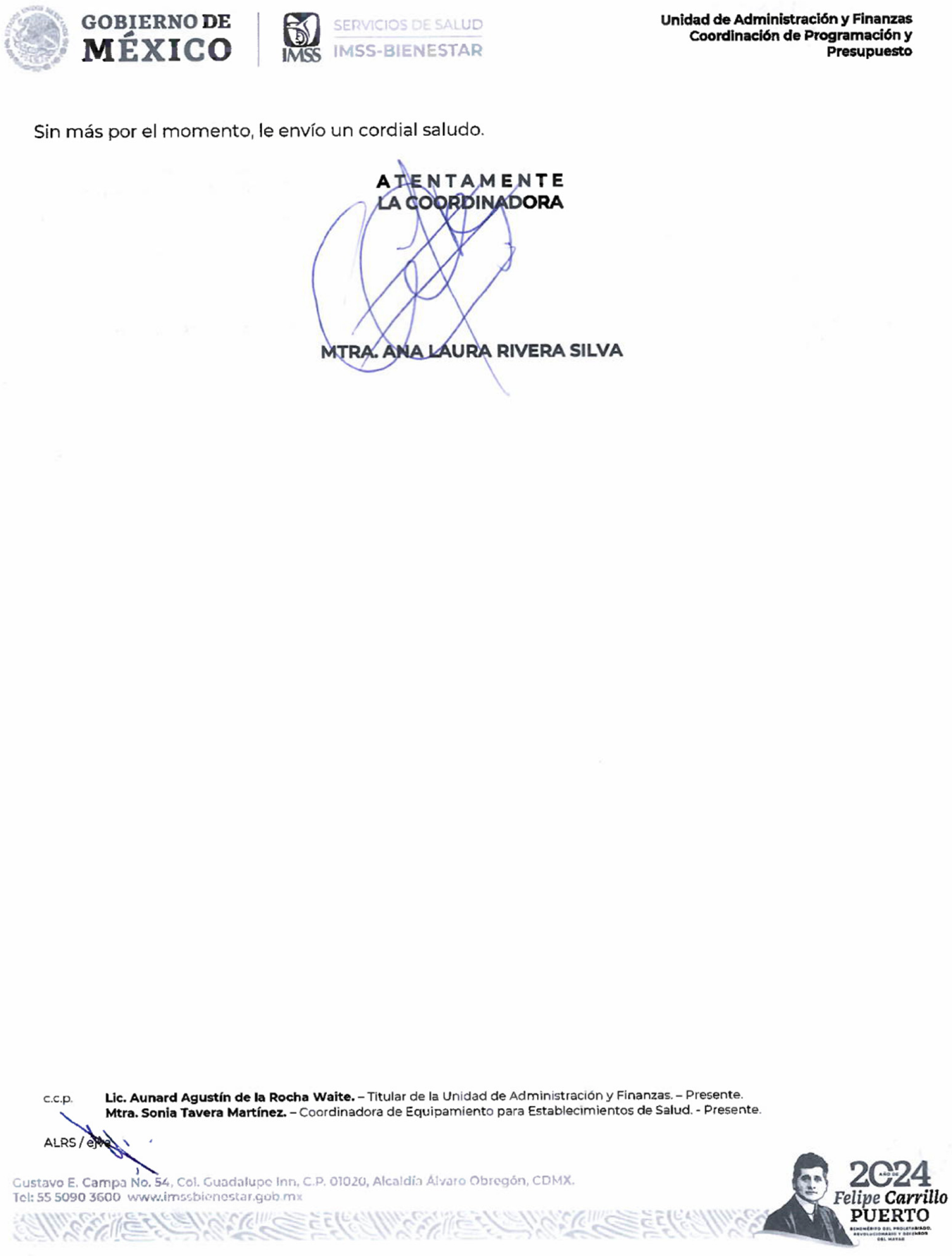 CONVENIO DE COORDINACIÓN EN MATERIA DE TRANSFERENCIA DE RECURSOS PRESUPUESTARIOS FEDERALES CON EL CARÁCTER DE SUBSIDIOS PARA APOYAR LA ADQUISICIÓN DE EQUIPAMIENTO PARA EL "CENTRO DE SALUD CON SERVICIOS AMPLIADOS DE SANTIAGO ASTATA", CON CARGO A LOS RECURSOS DEL PROGRAMA PRESUPUESTARIO E001 "ATENCIÓN A LA SALUD DE PERSONAS SIN SEGURIDAD SOCIAL", PARA EL EJERCICIO FISCAL 2024, EN ADELANTE "EL PROGRAMA", QUE CELEBRAN POR UNA PARTE, SERVICIOS DE SALUD DEL INSTITUTO MEXICANO DEL SEGURO SOCIAL PARA EL BIENESTAR, AL QUE EN LO SUCESIVO SE LE DENOMINARÁ EL "IMSS-BIENESTAR", REPRESENTADO POR EL DR. ALEJANDRO ANTONIO CALDERÓN ALIPI, EN SU CARÁCTER DE DIRECTOR GENERAL, ASISTIDO POR EL DR. VÍCTOR HUGO BORJA ABURTO, TITULAR DE LA UNIDAD DE ATENCIÓN A LA SALUD, EL ARQ. CARLOS SÁNCHEZ MENESES, TITULAR DE LA UNIDAD DE INFRAESTRUCTURA Y POR EL LIC. AUNARD AGUSTÍN DE LA ROCHA WAITE, TITULAR DE LA UNIDAD DE ADMINISTRACIÓN Y FINANZAS, Y POR LA OTRA PARTE, EL EJECUTIVO DEL GOBIERNO DEL ESTADO DE OAXACA AL QUE EN LO SUCESIVO SE LE DENOMINARÁ "EL GOBIERNO DE LA ENTIDAD", REPRESENTADO POR LA DRA. ALMA LILIA VELASCO HERNÁNDEZ, SECRETARIA DE SALUD Y DIRECTORA GENERAL DE LOS SERVICIOS DE SALUD DE OAXACA, ASISTIDA POR EL L.A. OCTAVIO TORRES CASTILLO, SUBDIRECTOR GENERAL DE ADMINISTRACIÓN Y FINANZAS; Y CON LA PARTICIPACIÓN DEL MTRO. FARID ACEVEDO LÓPEZ, SECRETARIO DE FINANZAS, A QUIENES DE MANERA CONJUNTA SE LES DENOMINARÁ COMO "LAS PARTES", AL TENOR DE LOS ANTECEDENTES, DECLARACIONES Y CLÁUSULAS SIGUIENTES: