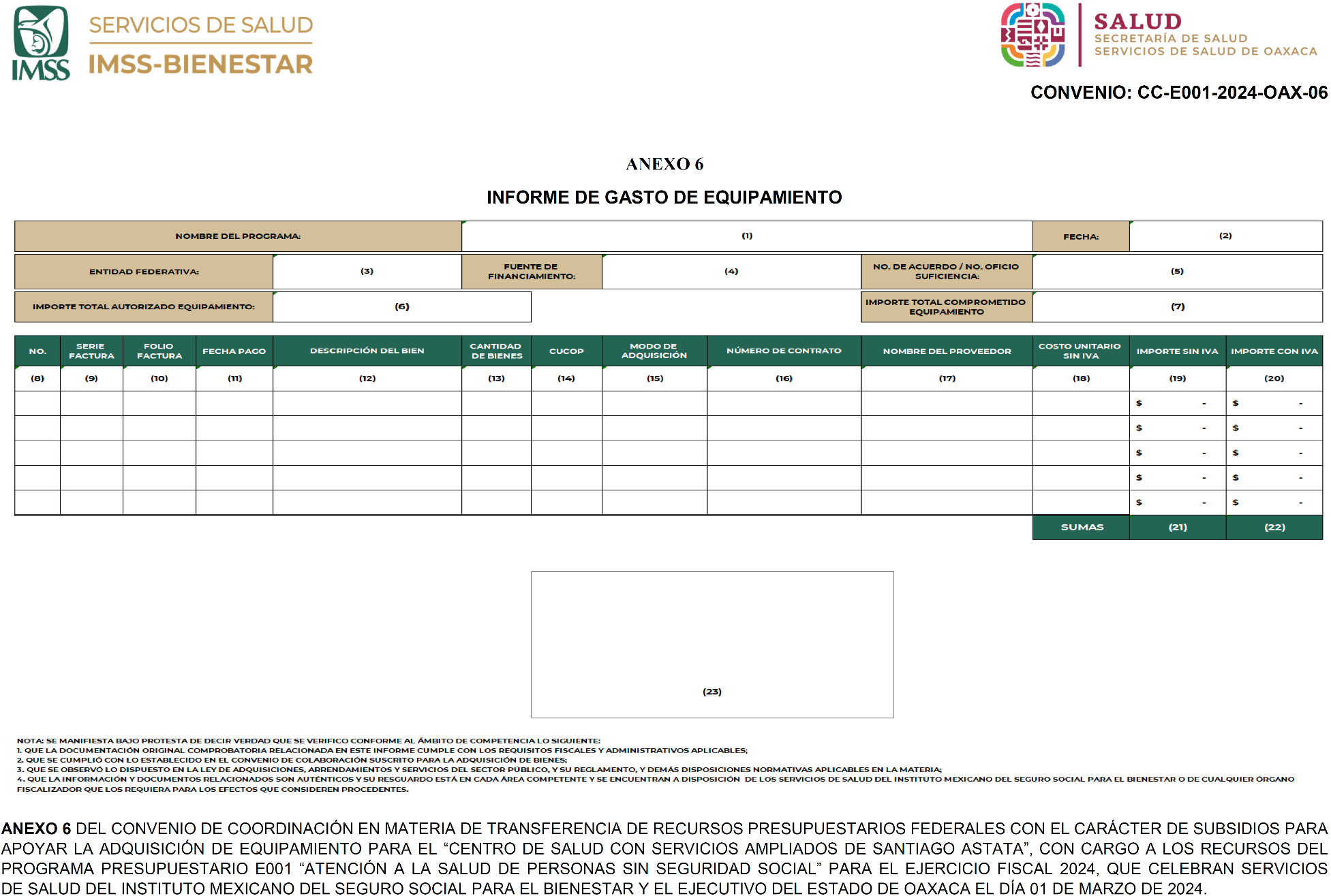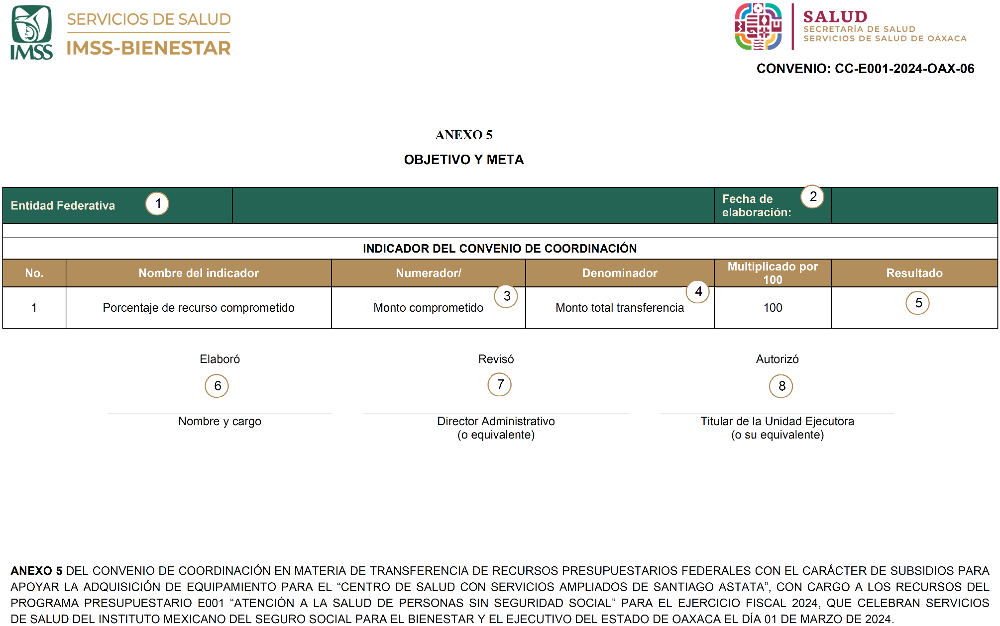 FIRMAS DE LOS ANEXOS 1, 2, 3, 4, 5, 6 y 7 DEL CONVENIO DE COORDINACIÓN EN MATERIA DE TRANSFERENCIA DE RECURSOS PRESUPUESTARIOS FEDERALES CON EL CARÁCTER DE SUBSIDIOS PARA APOYAR LA ADQUISICIÓN DE EQUIPAMIENTO PARA EL "CENTRO DE SALUD CON SERVICIOS AMPLIADOS DE SANTIAGO ASTATA", CON CARGO A LOS RECURSOS DEL PROGRAMA PRESUPUESTARIO E001 "ATENCIÓN A LA SALUD DE PERSONAS SIN SEGURIDAD SOCIAL" PARA EL EJERCICIO FISCAL 2024, QUE CELEBRAN SERVICIOS DE SALUD DEL INSTITUTO MEXICANO DEL SEGURO SOCIAL PARA EL BIENESTAR Y EL EJECUTIVO DEL ESTADO DE OAXACA EL DÍA 01 DE MARZO DE 2024.- Por el IMSS-BIENESTAR: Director General, Dr. Alejandro Antonio Calderón Alipi.- Rúbrica.- Titular de la Unidad de Atención a la Salud, Dr. Víctor Hugo Borja Aburto.- Rúbrica.- Titular de la Unidad de Infraestructura, Arq. Carlos Sánchez Meneses.- Rúbrica.- Titular de la Unidad de Administración y Finanzas, Lic. Aunard Agustín de la Rocha Waite.- Rúbrica.- Por el Gobierno de la Entidad: Secretaria de Salud y Directora General de los Servicios de Salud de Oaxaca, Dra. Alma Lilia Velasco Hernández.- Rúbrica.- Subdirector General de Administración y Finanzas de los Servicios de Salud de Oaxaca, L.A. Octavio Torres Castillo.- Rúbrica.- Secretario de Finanzas, Mtro. Farid Acevedo López.- Rúbrica.