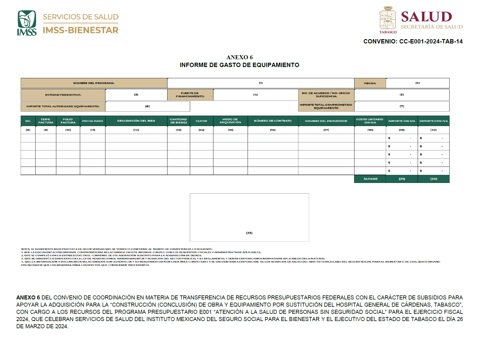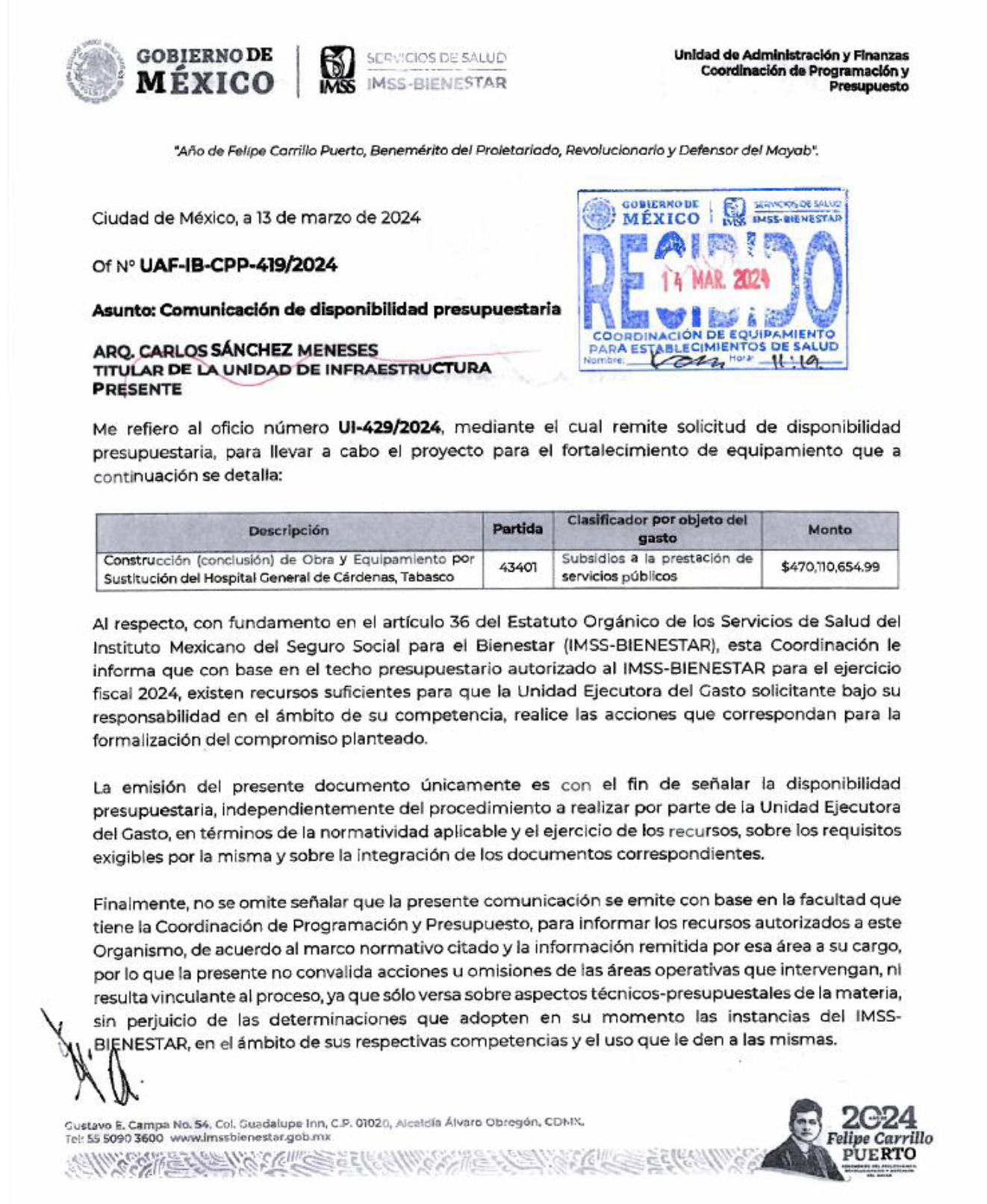 | 1 | TCSSA000306 | Hospital General de Cárdenas | Calle Abraham Bandala No. 601, Cárdenas, Tabasco. C.P. 86500. | $470,110,654.99 |