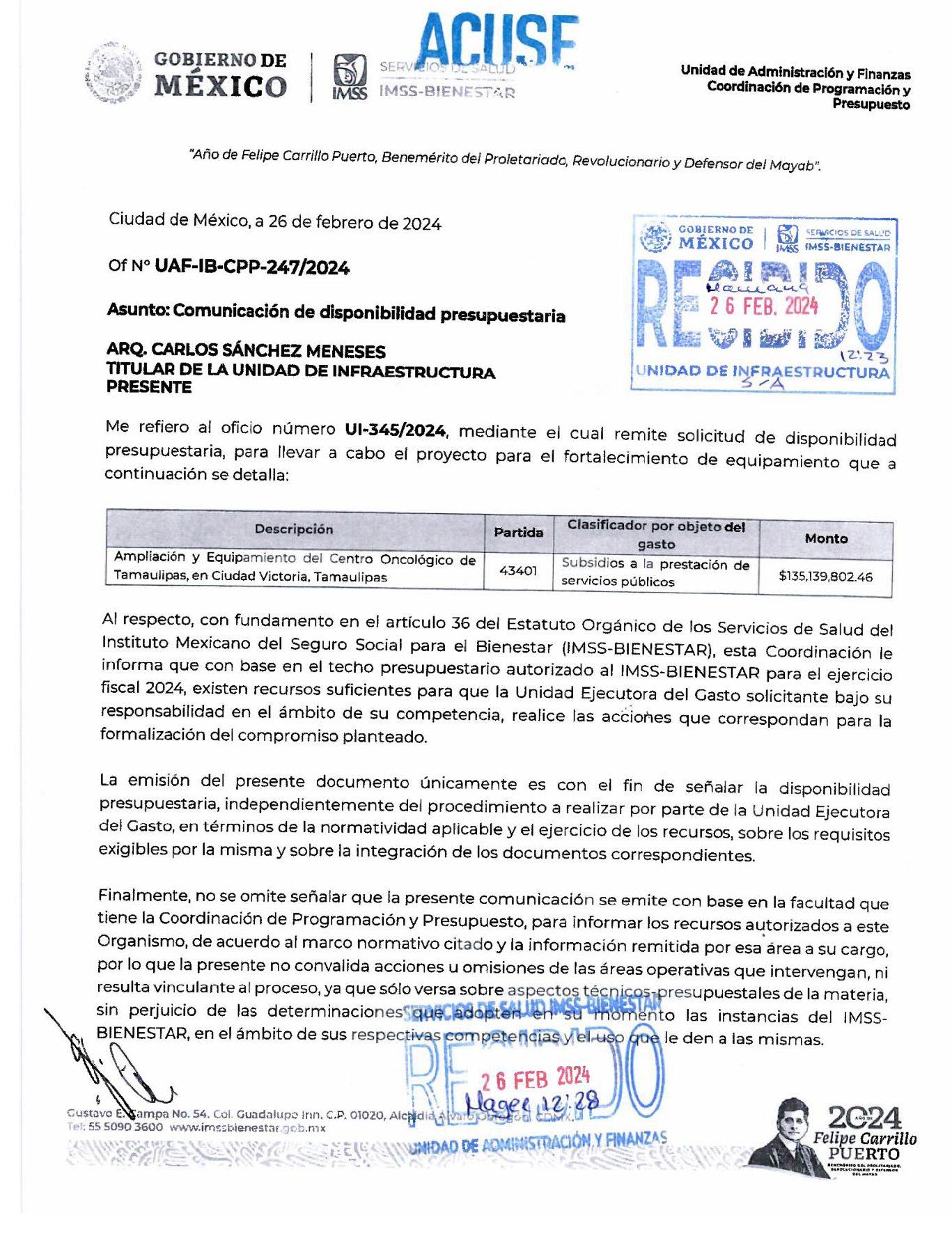 10. Por medio del oficio número UAF-IB-CPP-247/2024, de fecha 26 de febrero de 2024, la Coordinación de Programación y Presupuesto del "IMSS-BIENESTAR" notificó la reserva de recursos hasta por la cantidad de $135,139,802.46 (CIENTO TREINTA Y CINCO MILLONES CIENTO TREINTA Y NUEVE MIL OCHOCIENTOS DOS PESOS 46/100 M.N.), con cargo al programa Presupuestario E001, "Atención a la Salud de Personas sin Seguridad Social", oficio que se agrega como ANEXO 1.