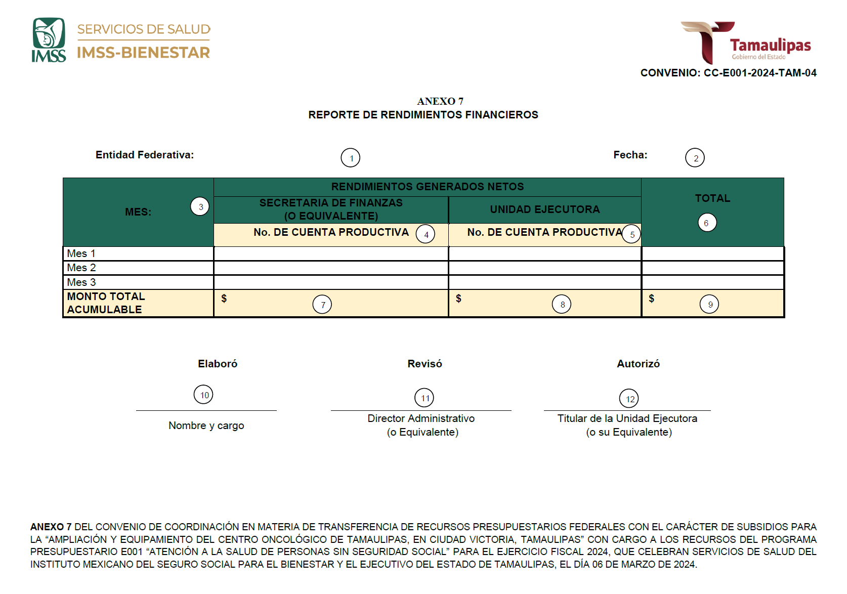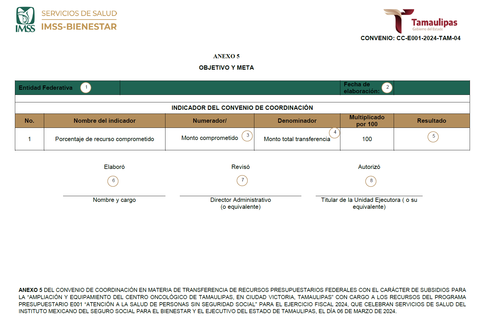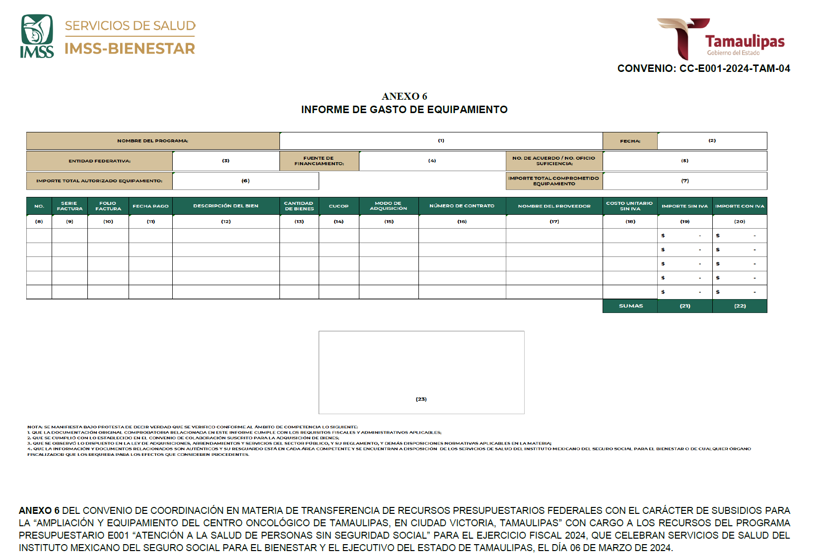 FIRMAS DE LOS ANEXOS 1, 2, 3, 4, 5, 6 y 7 DEL CONVENIO DE COORDINACIÓN EN MATERIA DE TRANSFERENCIA DE RECURSOS PRESUPUESTARIOS FEDERALES CON EL CARÁCTER DE SUBSIDIOS PARA LA "AMPLIACIÓN Y EQUIPAMIENTO DEL CENTRO ONCOLÓGICO DE TAMAULIPAS, EN CIUDAD VICTORIA, TAMAULIPAS" CON CARGO A LOS RECURSOS DEL PROGRAMA PRESUPUESTARIO E001 "ATENCIÓN A LA SALUD DE PERSONAS SIN SEGURIDAD SOCIAL" PARA EL EJERCICIO FISCAL 2024, QUE CELEBRAN SERVICIOS DE SALUD DEL INSTITUTO MEXICANO DEL SEGURO SOCIAL PARA EL BIENESTAR Y EL EJECUTIVO DEL ESTADO DE TAMAULIPAS, EL DÍA 06 DE MARZO DE 2024.- Por el IMSS-BIENESTAR: Director General, Dr. Alejandro Antonio Calderón Alipi.- Rúbrica.- Titular de la Unidad de Atención a la Salud, Dr. Víctor Hugo Borja Aburto.- Rúbrica.- Titular de la Unidad de Infraestructura, Arq. Carlos Sánchez Meneses.- Rúbrica.- Titular de la Unidad de Administración y Finanzas, Lic. Aunard Agustín de la Rocha Waite.- Rúbrica.- Por el Gobierno de la Entidad: Secretario de Salud y Director General de OPD Servicios de Salud de Tamaulipas, Dr. Vicente Joel Hernández Navarro.- Rúbrica.- Secretaria de Finanzas del Estado de Tamaulipas, Lic. Adriana Lozano Rodríguez.- Rúbrica.