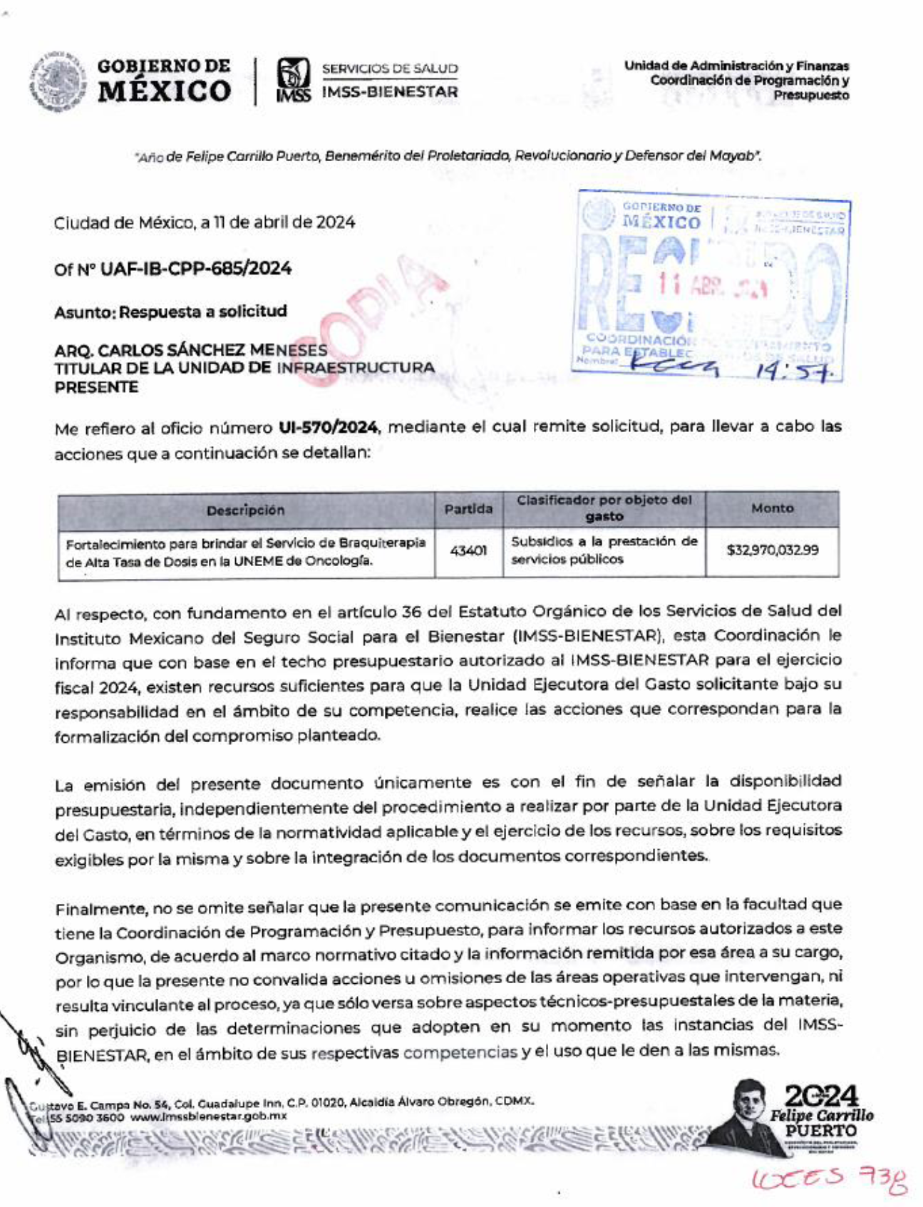 10. Por medio del oficio número UAF-IB-CPP-685/2024, de fecha 11 de abril del 2024, la Coordinación de Programación y Presupuesto del "IMSS-BIENESTAR" notificó la reserva de recursos hasta por la cantidad de $32,970,032.99 (TREINTA Y DOS MILLONES NOVECIENTOS SETENTA MIL TREINTA Y DOS PESOS 99/100 M.N.), con cargo al programa Presupuestario E001, "Atención a la Salud de Personas sin Seguridad Social", oficio que se agrega como ANEXO 1.