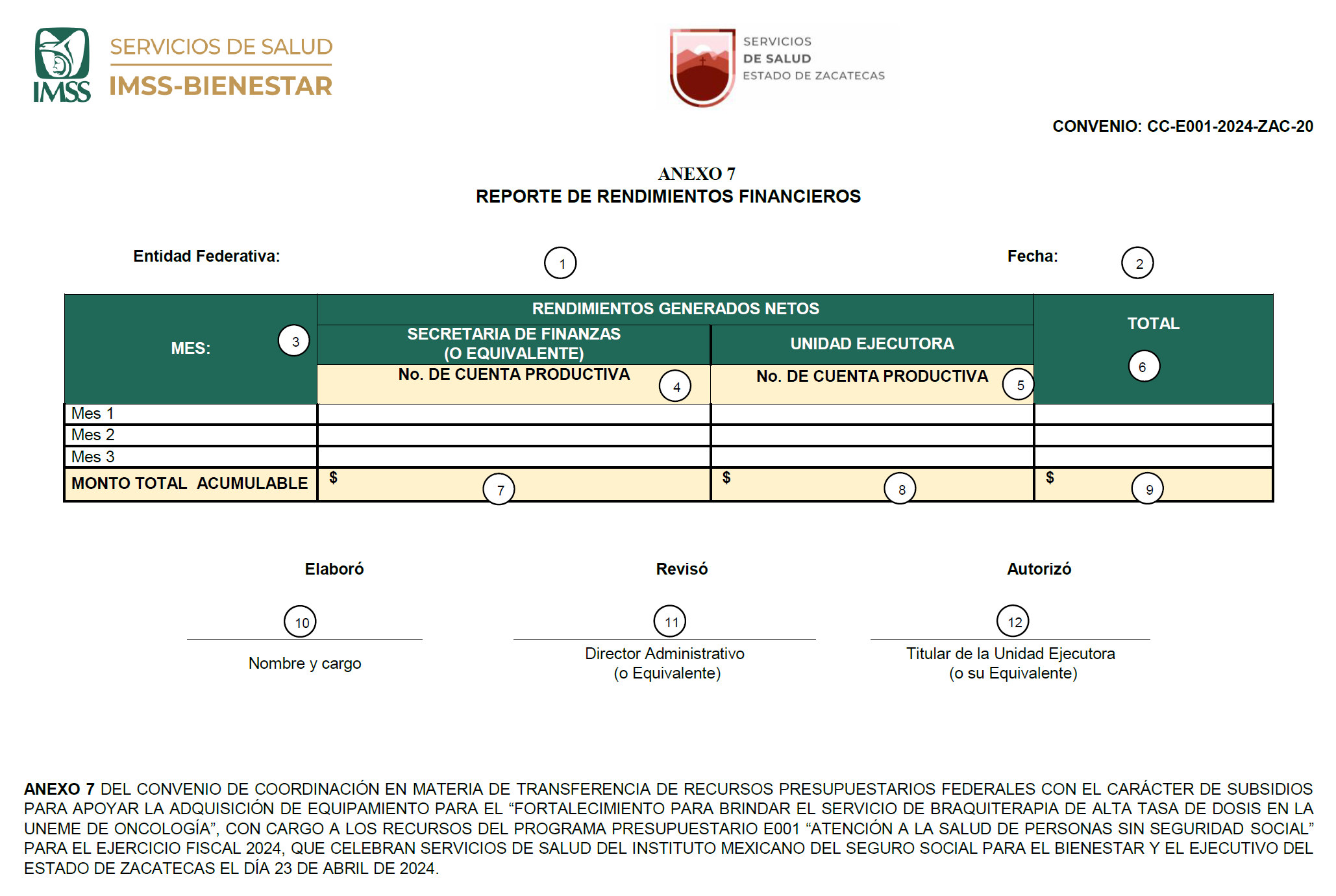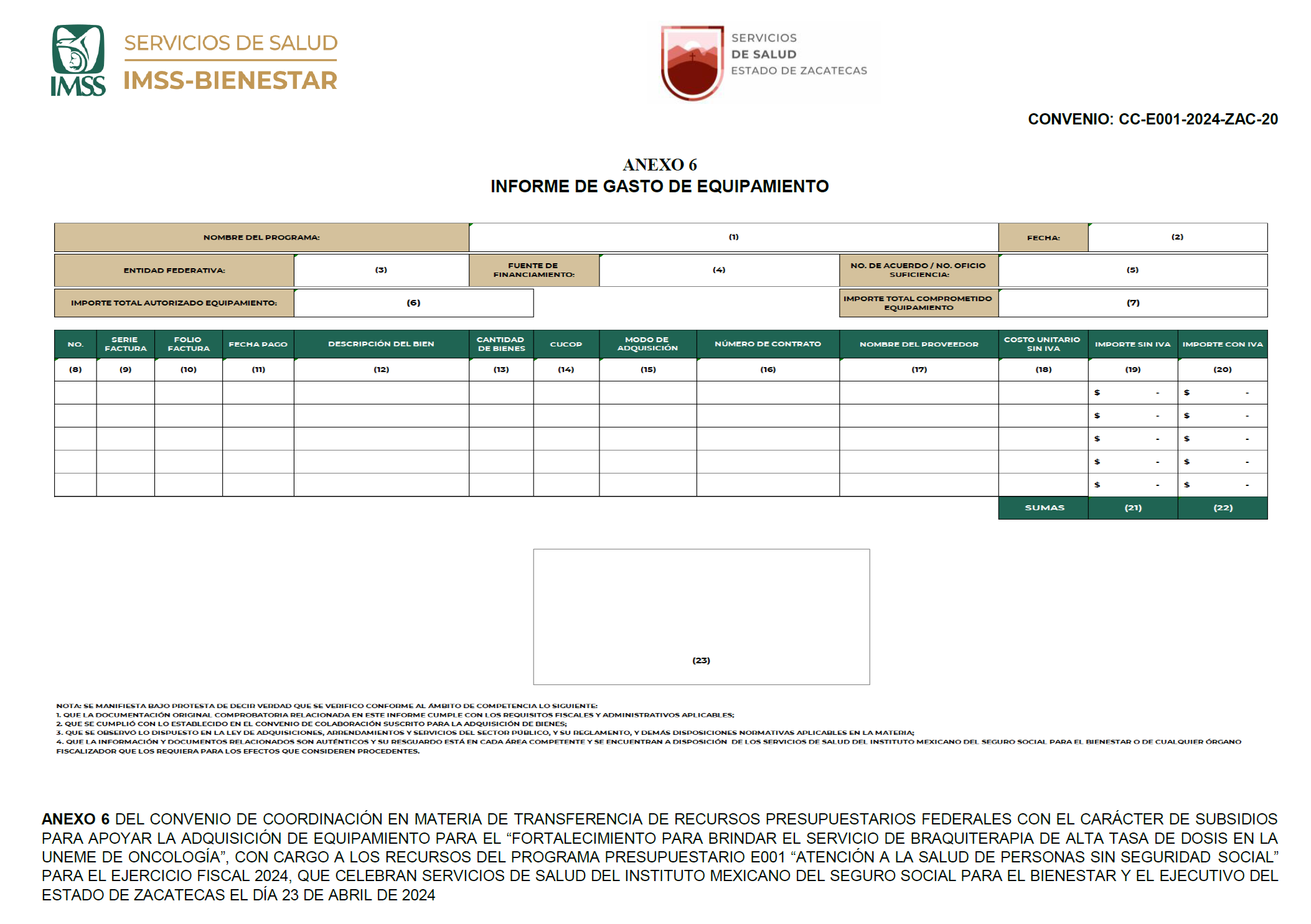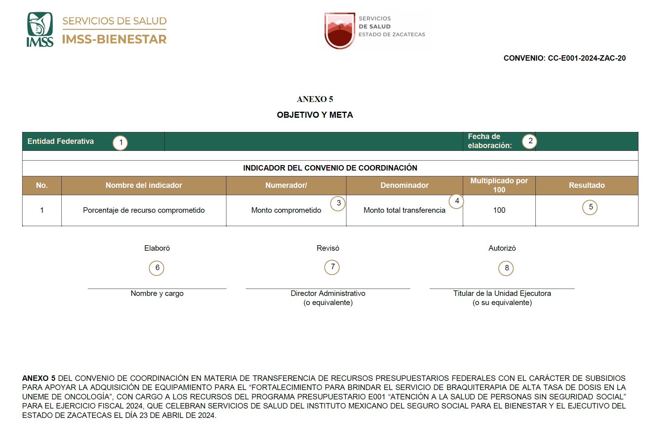 FIRMAS DE LOS ANEXOS 1, 2, 3, 4, 5, 6 y 7 DEL CONVENIO DE COORDINACIÓN EN MATERIA DE TRANSFERENCIA DE RECURSOS PRESUPUESTARIOS FEDERALES CON EL CARÁCTER DE SUBSIDIOS PARA APOYAR LA ADQUISICIÓN DE EQUIPAMIENTO PARA EL "FORTALECIMIENTO PARA BRINDAR EL SERVICIO DE BRAQUITERAPIA DE ALTA TASA DE DOSIS EN LA UNEME DE ONCOLOGÍA", CON CARGO A LOS RECURSOS DEL PROGRAMA PRESUPUESTARIO E001 "ATENCIÓN A LA SALUD DE PERSONAS SIN SEGURIDAD SOCIAL" PARA EL EJERCICIO FISCAL 2024, QUE CELEBRAN SERVICIOS DE SALUD DEL INSTITUTO MEXICANO DEL SEGURO SOCIAL PARA EL BIENESTAR Y EL EJECUTIVO DEL ESTADO DE ZACATECAS EL DÍA 23 DE ABRIL DE 2024.- Por el IMSS-BIENESTAR: Director General, Dr. Alejandro Antonio Calderón Alipi.- Rúbrica.- Titular de la Unidad de Atención a la Salud, Dr. Víctor Hugo Borja Aburto.- Rúbrica.- Titular de la Unidad de Infraestructura, Arq. Carlos Sánchez Meneses.- Rúbrica.- Titular de la Unidad de Administración y Finanzas, Lic. Aunard Agustín de la Rocha Waite.- Rúbrica.- Por el Gobierno de la Entidad: Secretario de Finanzas del Estado de Zacatecas, Dr. Ricardo Olivares Sanchez.- Rúbrica.- Secretario de Salud y Director General de los Servicios de Salud de Zacatecas, Dr. Uswaldo Pinedo Barrios.- Rúbrica.