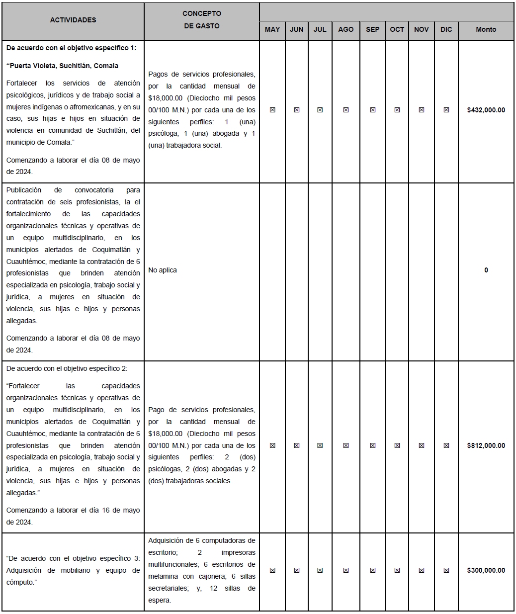 CEPCONAVIM/2SO/176/10062024. El Comité de Evaluación de Proyectos en términos de los numerales Vigésimo segundo, Vigésimo cuarto, Vigésimo Sexto incisos e) y h) y Trigésimo Octavo de los Lineamientos aplicables, por unanimidad de votos aprueba la solicitud de la modificación del Anexo Técnico del Proyecto AVGM/COL/AC01/ICM/028, para dar inició a las actividades el 08 de mayo de 2024, así como para la contratación de una Psicóloga del 01 de julio al 31 de diciembre de 2024 y la compra de una lap top para la Profesionista encargada de la Coordinación.