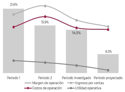 163. Adicionalmente, los resultados operativos proyectados reflejarían una disminución de los ingresos por ventas en el mercado interno de 12%, mientras que los costos de operación lo harían en 4%, dando como resultado una baja de 62% en la utilidad operativa. En este sentido, se observaría una disminución del margen de operación de 8.2 puntos porcentuales al pasar de 14.5% en el periodo investigado a 6.3% en el periodo de proyección, tal como se observa en la siguiente gráfica.