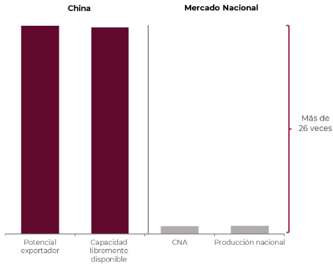 174. Los resultados descritos en los puntos anteriores sustentan, inicialmente, que China cuenta con una capacidad libremente disponible y un potencial exportador superiores en relación con el mercado nacional. Estas asimetrías aportan elementos suficientes que permiten determinar que la utilización de una parte de la capacidad libremente disponible con que cuenta China, o bien, de su potencial exportador, podría ser significativa para la producción y el mercado mexicano.