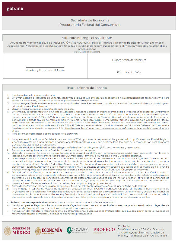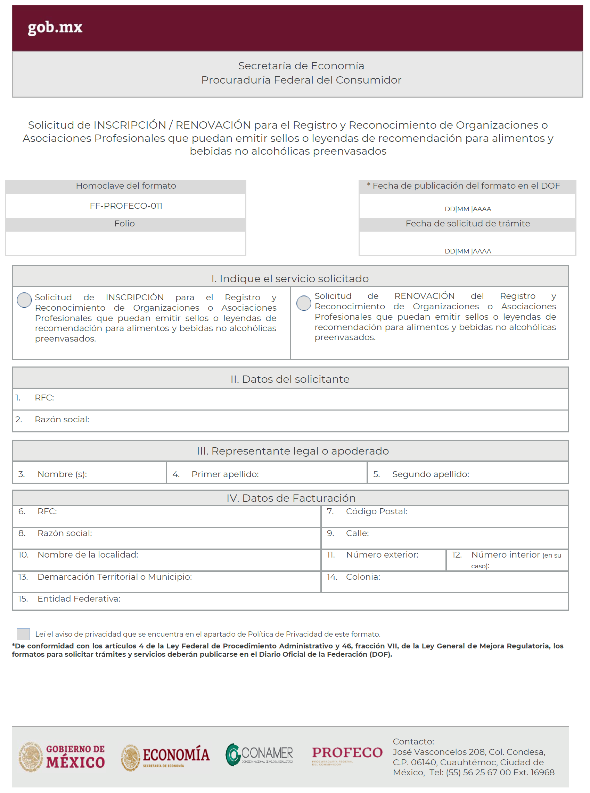 10. Solicitud de Inscripción/Renovación para el Registro y Reconocimiento de Organizaciones o Asociaciones Profesionales que puedan emitir sellos o leyendas de recomendación para alimentos y bebidas no alcohólicas preenvasados (FF-PROFECO-011).