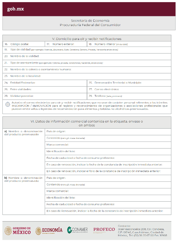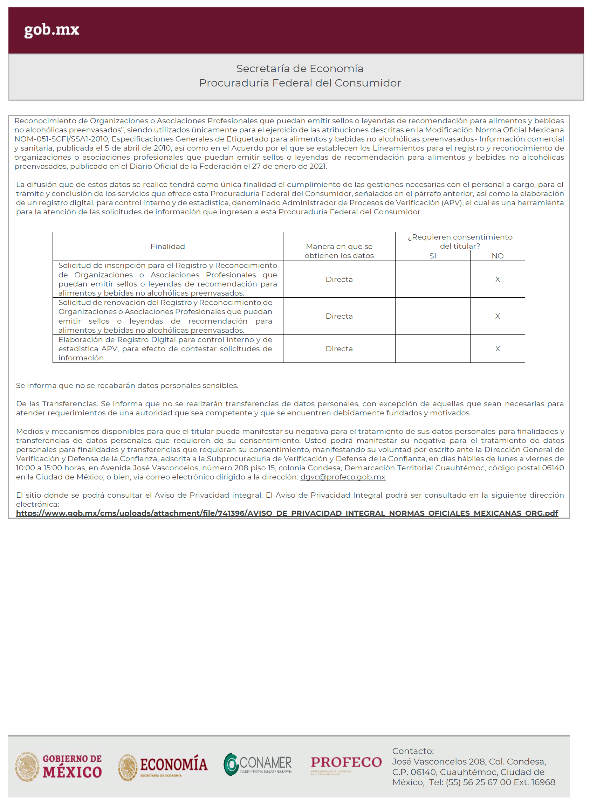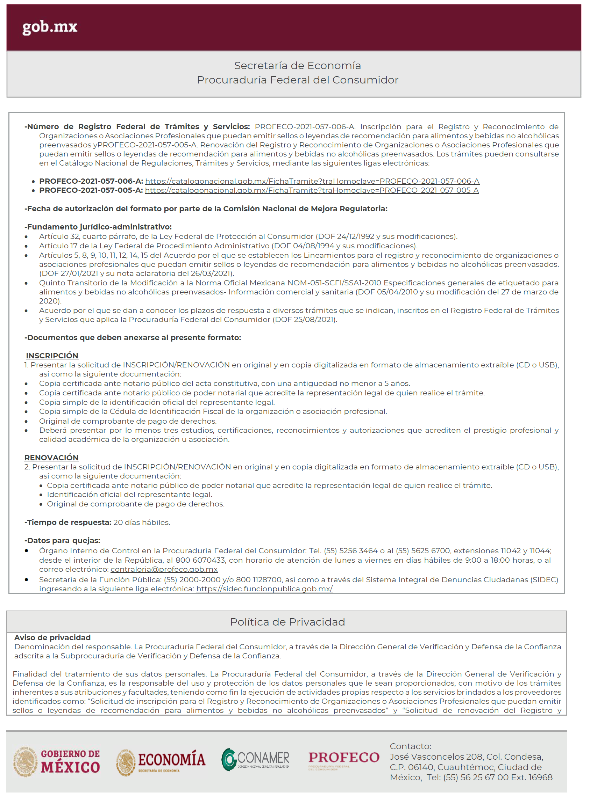 Que el 27 de enero de 2021 se publicó en el DOF el Acuerdo por el que se establecen los Lineamientos para el registro y reconocimiento de organizaciones o asociaciones profesionales que puedan emitir sellos o leyendas de recomendación para alimentos y bebidas no alcohólicas preenvasados, del cual derivaron nuevos trámites ante la Profeco como lo son las solicitudes de inscripción y de renovación en el mencionado registro, por lo que es necesario dar a conocer los formatos correspondientes para presentar dichas solicitudes;