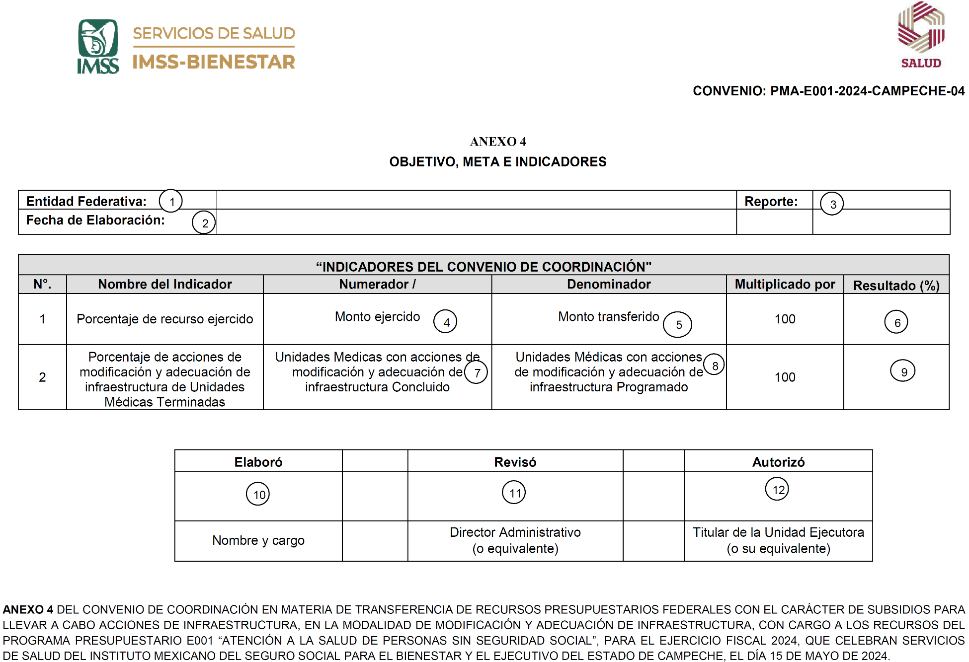 ANEXO 4 DEL CONVENIO DE COORDINACIÓN EN MATERIA DE TRANSFERENCIA DE RECURSOS PRESUPUESTARIOS FEDERALES CON EL CARÁCTER DE SUBSIDIOS PARA LLEVAR A CABO ACCIONES DE INFRAESTRUCTURA, EN LA MODALIDAD DE MODIFICACIÓN Y ADECUACIÓN DE INFRAESTRUCTURA, CON CARGO A LOS RECURSOS DEL PROGRAMA PRESUPUESTARIO E001 "ATENCIÓN A LA SALUD DE PERSONAS SIN SEGURIDAD SOCIAL", PARA EL EJERCICIO FISCAL 2024, QUE CELEBRAN SERVICIOS DE SALUD DEL INSTITUTO MEXICANO DEL SEGURO SOCIAL PARA EL BIENESTAR Y EL EJECUTIVO DEL ESTADO DE CAMPECHE, EL DÍA 15 DE MAYO DE 2024.