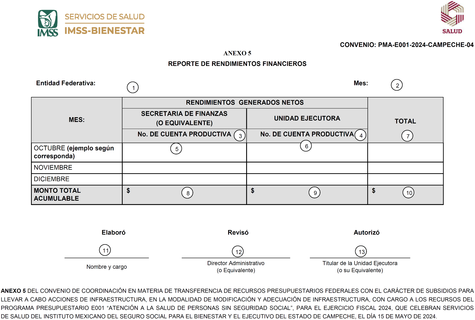 ANEXO 5 DEL CONVENIO DE COORDINACIÓN EN MATERIA DE TRANSFERENCIA DE RECURSOS PRESUPUESTARIOS FEDERALES CON EL CARÁCTER DE SUBSIDIOS PARA LLEVAR A CABO ACCIONES DE INFRAESTRUCTURA, EN LA MODALIDAD DE MODIFICACIÓN Y ADECUACIÓN DE INFRAESTRUCTURA, CON CARGO A LOS RECURSOS DEL PROGRAMA PRESUPUESTARIO E001 "ATENCIÓN A LA SALUD DE PERSONAS SIN SEGURIDAD SOCIAL", PARA EL EJERCICIO FISCAL 2024, QUE CELEBRAN SERVICIOS DE SALUD DEL INSTITUTO MEXICANO DEL SEGURO SOCIAL PARA EL BIENESTAR Y EL EJECUTIVO DEL ESTADO DE CAMPECHE, EL DÍA 15 DE MAYO DE 2024.