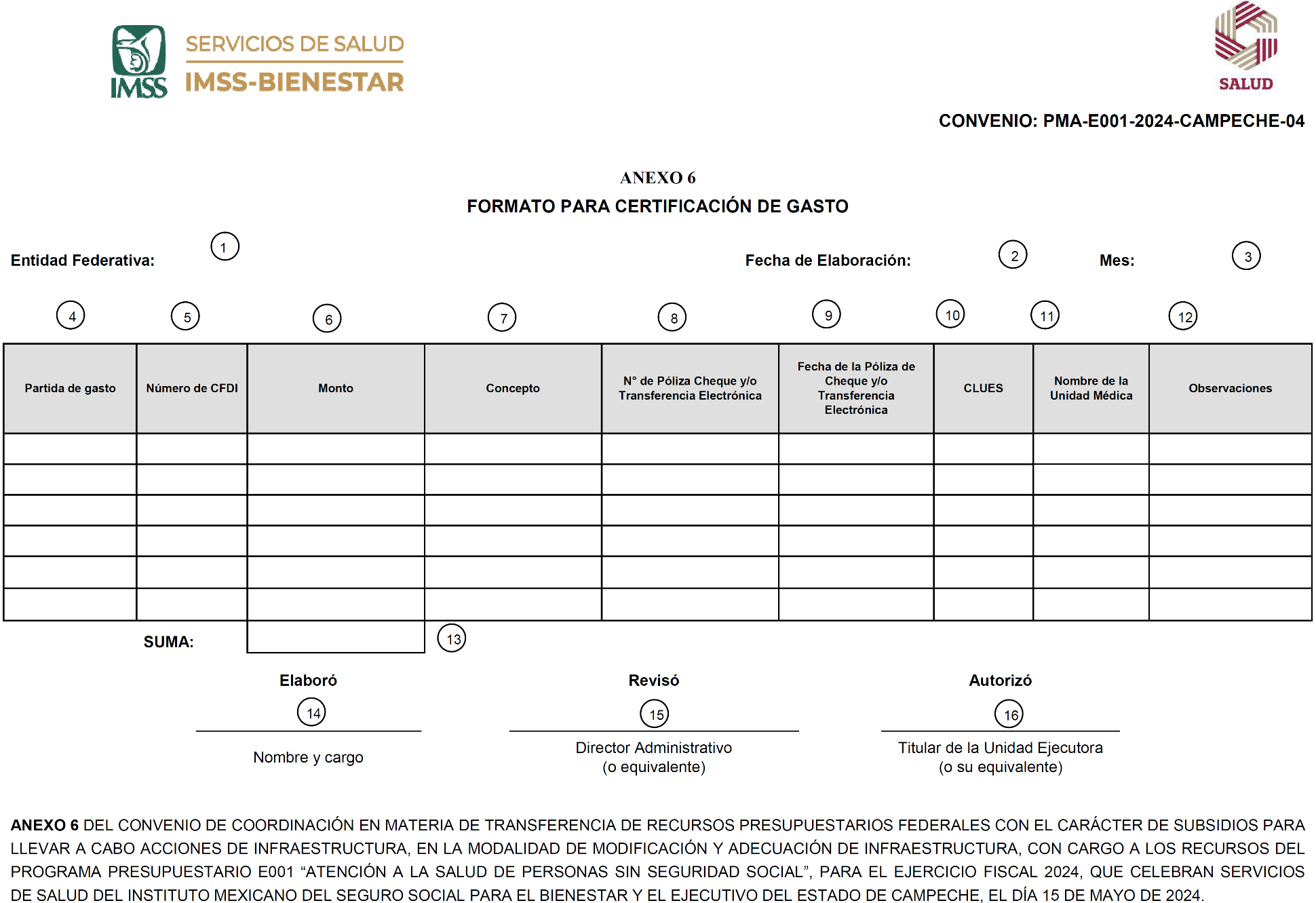 ANEXO 6 DEL CONVENIO DE COORDINACIÓN EN MATERIA DE TRANSFERENCIA DE RECURSOS PRESUPUESTARIOS FEDERALES CON EL CARÁCTER DE SUBSIDIOS PARA LLEVAR A CABO ACCIONES DE INFRAESTRUCTURA, EN LA MODALIDAD DE MODIFICACIÓN Y ADECUACIÓN DE INFRAESTRUCTURA, CON CARGO A LOS RECURSOS DEL PROGRAMA PRESUPUESTARIO E001 "ATENCIÓN A LA SALUD DE PERSONAS SIN SEGURIDAD SOCIAL", PARA EL EJERCICIO FISCAL 2024, QUE CELEBRAN SERVICIOS DE SALUD DEL INSTITUTO MEXICANO DEL SEGURO SOCIAL PARA EL BIENESTAR Y EL EJECUTIVO DEL ESTADO DE CAMPECHE, EL DÍA 15 DE MAYO DE 2024.