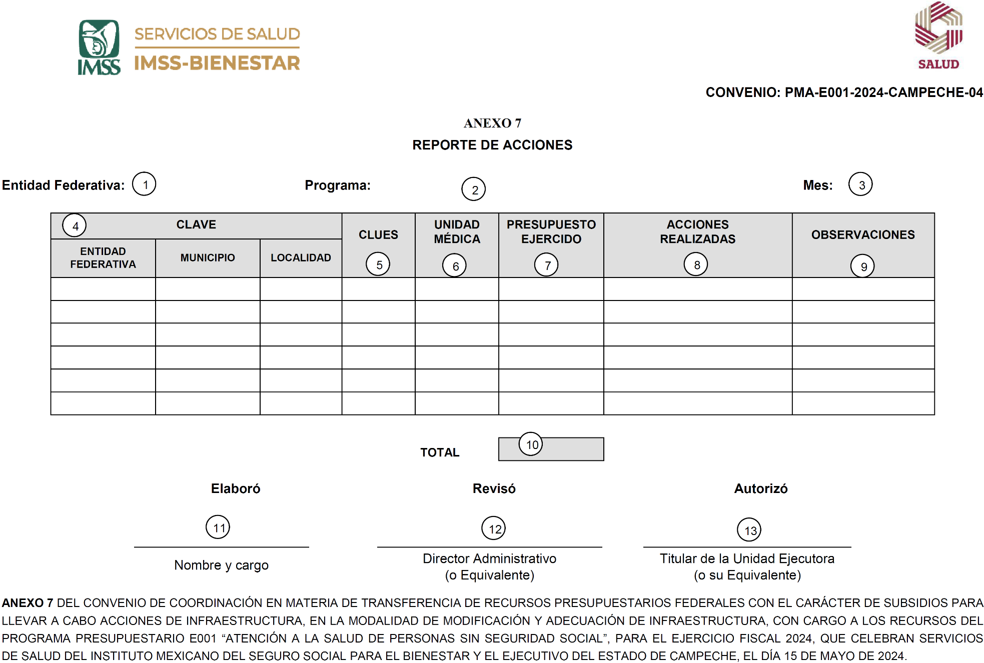 ANEXO 7 DEL CONVENIO DE COORDINACIÓN EN MATERIA DE TRANSFERENCIA DE RECURSOS PRESUPUESTARIOS FEDERALES CON EL CARÁCTER DE SUBSIDIOS PARA LLEVAR A CABO ACCIONES DE INFRAESTRUCTURA, EN LA MODALIDAD DE MODIFICACIÓN Y ADECUACIÓN DE INFRAESTRUCTURA, CON CARGO A LOS RECURSOS DEL PROGRAMA PRESUPUESTARIO E001 "ATENCIÓN A LA SALUD DE PERSONAS SIN SEGURIDAD SOCIAL", PARA EL EJERCICIO FISCAL 2024, QUE CELEBRAN SERVICIOS DE SALUD DEL INSTITUTO MEXICANO DEL SEGURO SOCIAL PARA EL BIENESTAR Y EL EJECUTIVO DEL ESTADO DE CAMPECHE, EL DÍA 15 DE MAYO DE 2024.