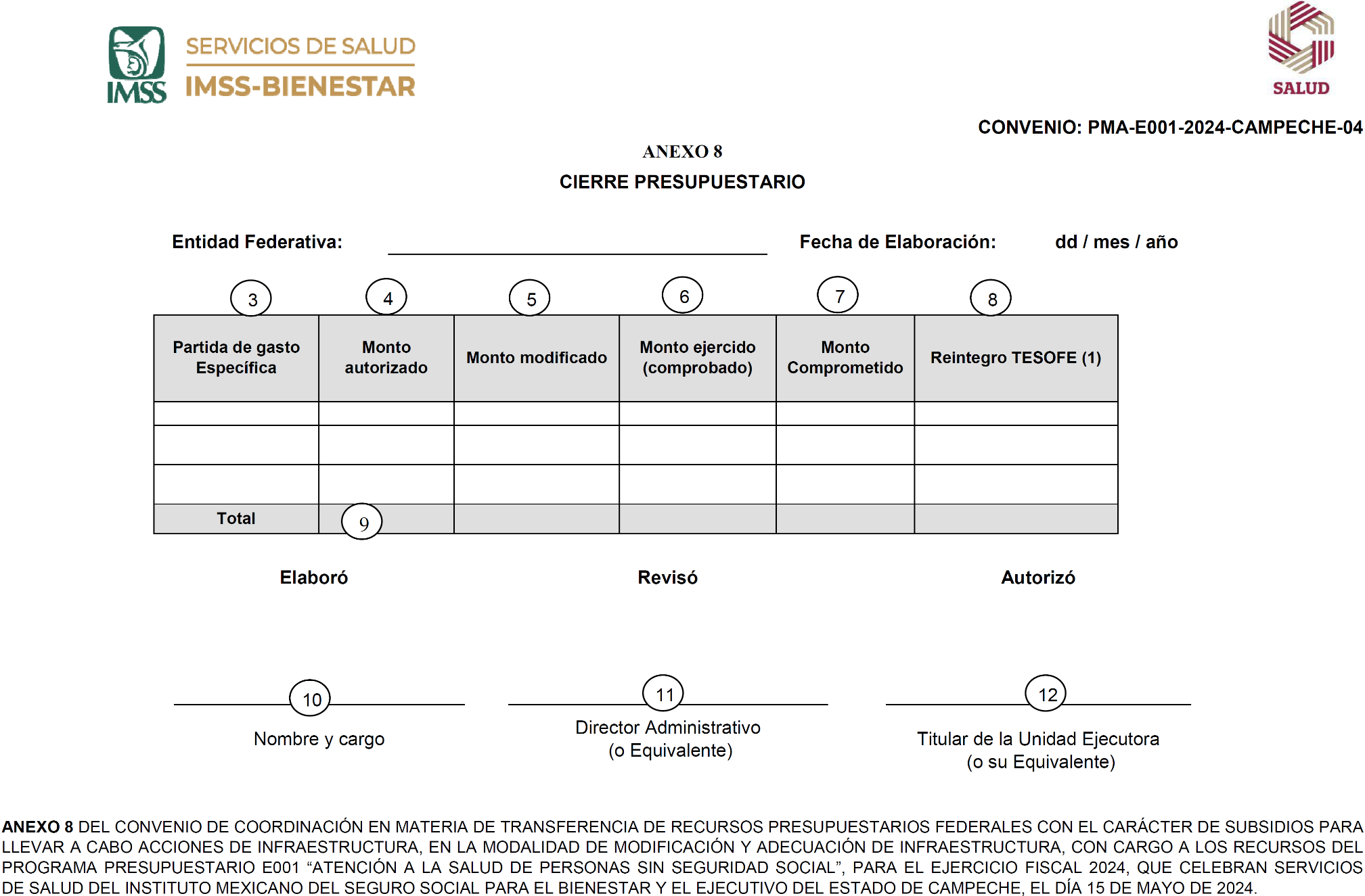 FIRMAS DE LOS ANEXOS 1, 2, 3, 4, 5, 6, 7 Y 8 DEL CONVENIO DE COORDINACIÓN EN MATERIA DE TRANSFERENCIA DE RECURSOS PRESUPUESTARIOS FEDERALES CON EL CARÁCTER DE SUBSIDIOS PARA LLEVAR A CABO ACCIONES DE INFRAESTRUCTURA, EN LA MODALIDAD DE MODIFICACIÓN Y ADECUACIÓN DE INFRAESTRUCTURA, CON CARGO A LOS RECURSOS DEL PROGRAMA PRESUPUESTARIO E001 "ATENCIÓN A LA SALUD DE PERSONAS SIN SEGURIDAD SOCIAL", PARA EL EJERCICIO FISCAL 2024, QUE CELEBRAN SERVICIOS DE SALUD DEL INSTITUTO MEXICANO DEL SEGURO SOCIAL PARA EL BIENESTAR Y EL EJECUTIVO DEL ESTADO DE CAMPECHE, EL DÍA 15 DE MAYO DE 2024.