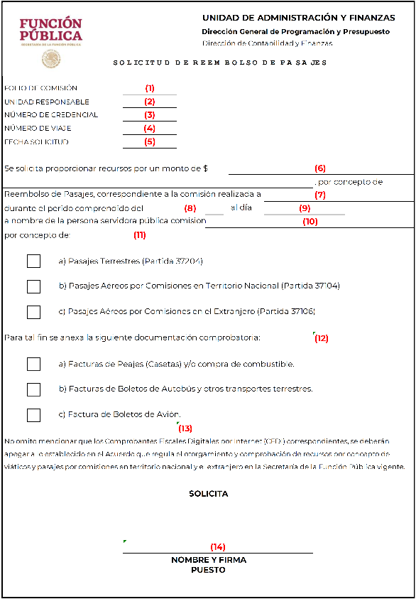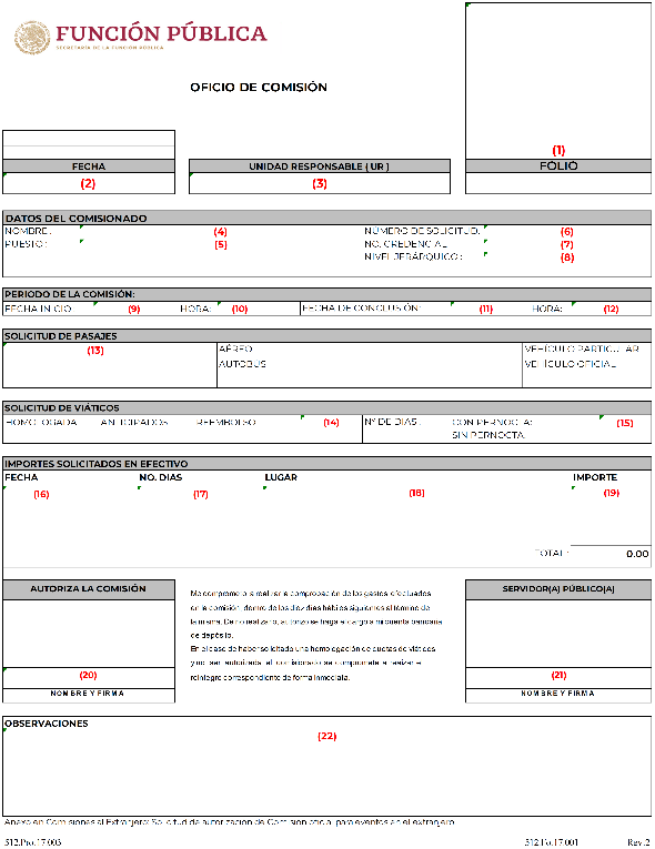 | 1 | Número de Folio del Oficio de Comisión (Asignado por la Subdirección de Viáticos y Pasajes). |