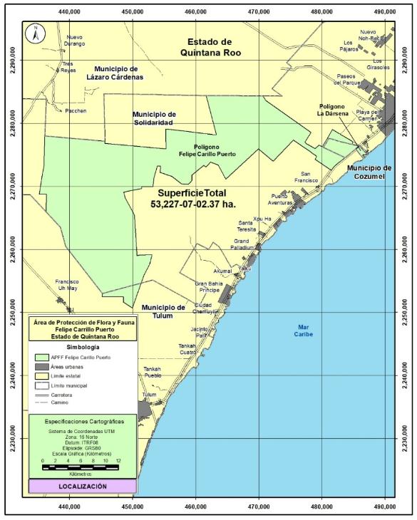 Con Aviso publicado en el Diario Oficial de la Federación el 18 de julio de 2024, se informó al público en general que estaba a su disposición el estudio realizado por la Secretaría de Medio Ambiente y Recursos Naturales por conducto de la Comisión Nacional de Áreas Naturales Protegidas, para justificar la expedición del Decreto por el que se pretende declarar el área natural protegida con el carácter de área de protección de flora y fauna Felipe Carrillo Puerto, ubicada en los municipios de Solidaridad, Cozumel y Tulum, en el estado de Quintana Roo, mismo que posee las características que se citan a continuación para su identificación: