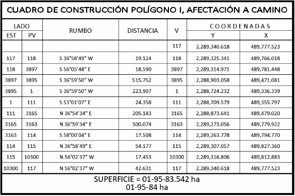 21. Que el comisionado técnico del RAN y el comisionado agrario de la Sedatu rindieron el "informe de comisión de Trabajos Técnicos e Informativos de Expropiación", de 11 de diciembre de 2023, en el que señalan que la superficie real a expropiar al ejido "Playa del Carmen", municipio de Solidaridad, estado de Quintana Roo es de 01-95-84 ha de uso común, que se describen en el siguiente plano y cuadro de construcción:
