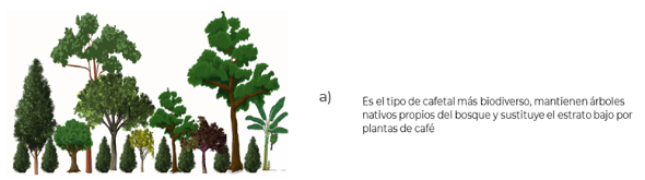 | Presencia de especies de plantas en los diferentes estratos del cafetal | 3. Presencia de árboles que no comprometan la producción del sistema agroecológico (diversidad estructural) en dos estratos: 1. Árboles de porte alto (dosel) y 2. Árboles de porte medio 3. Arbustos y árboles de porte bajo | |