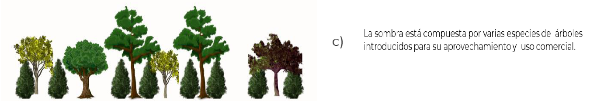 | 2. Del total de sombra en su cafetal, indique el tipo de sombra y porcentaje que maneja(2): a) Sombra de árboles de porte alto cubre el 60% del cafetal; árboles de porte medio y bajo cubren el 40% b) Sombra de árboles de porte alto cubren entre el 40 y el 60 % del cafetal; árboles de porte medio y bajo cubren entre 40 y el 60 % c) Sombra de árboles de porte alto cubren el 40% del cafetal; árboles de porte medio y bajo cubren el 60% | | a=0 b=1 c=2 |