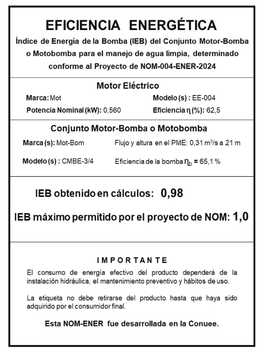 PROYECTO DE NORMA OFICIAL MEXICANA PROY-NOM-004-ENER-2024, EFICIENCIA ENERGÉTICA PARA EL CONJUNTO MOTORBOMBA Y MOTOBOMBAS, PARA BOMBEO DE AGUA LIMPIA, EN POTENCIAS DE 0,149 kW (1/5 HP) HASTA 1,492 kW (2 HP) LÍMITES, MÉTODOS DE PRUEBA Y ETIQUETADO.