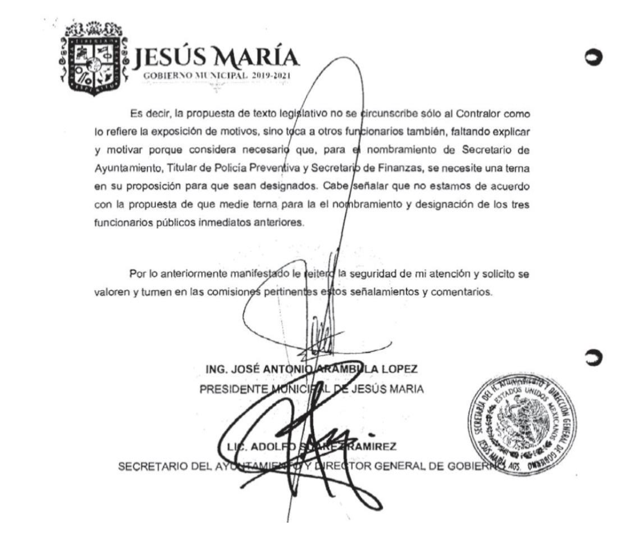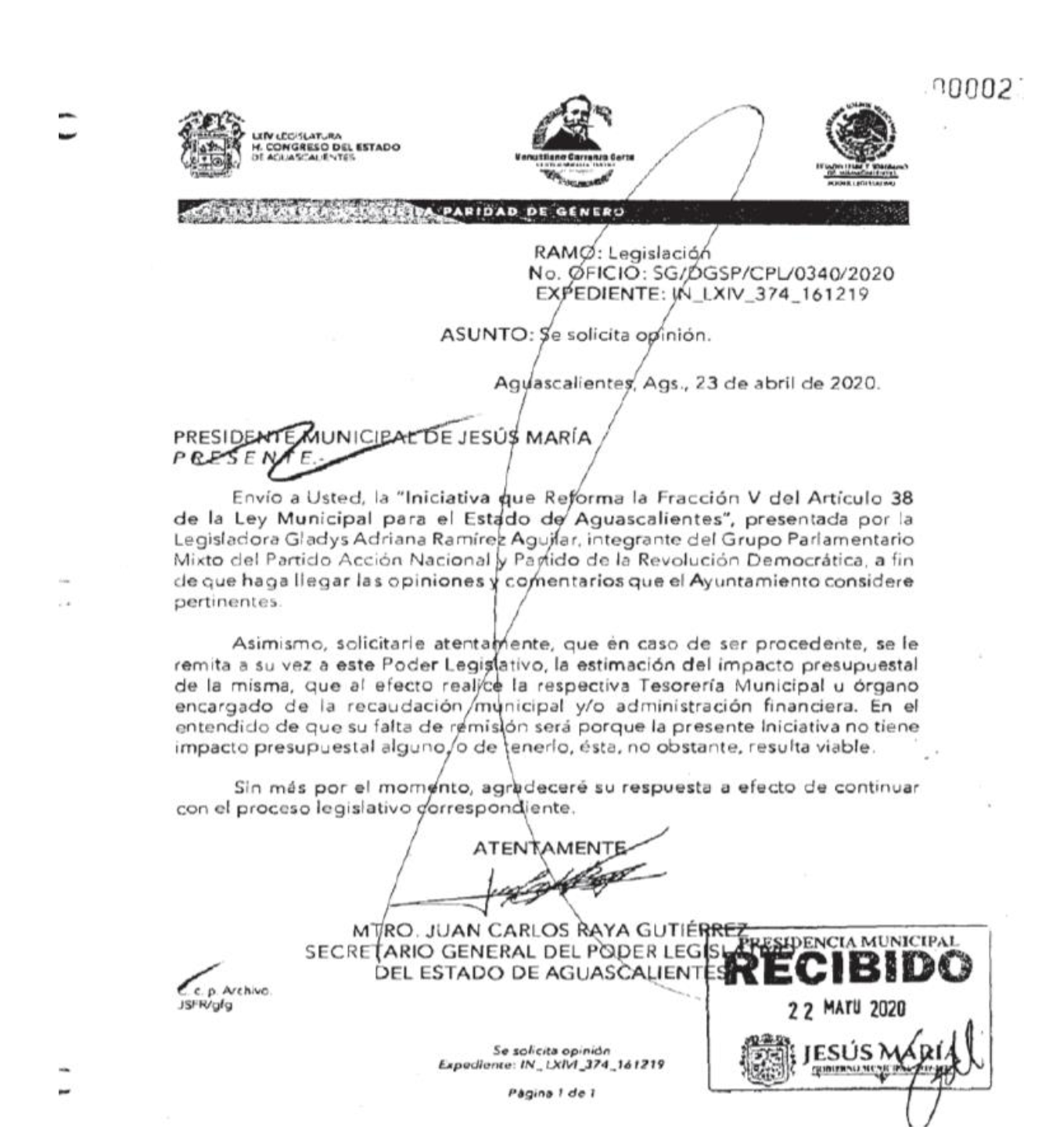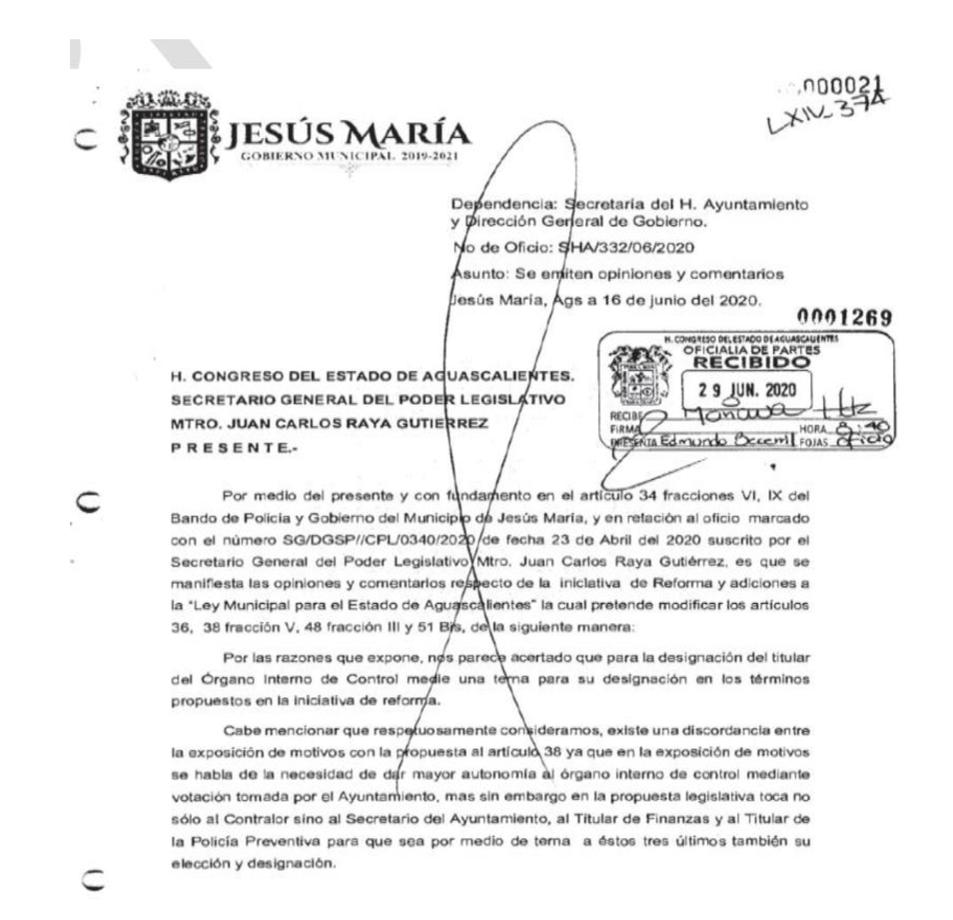 · En contra de lo manifestado por la parte actora, en el caso concreto sí se cumplió con lo determinado por el numeral 31 de la Constitución Política del Estado de Aguascalientes, en tanto que, mediante oficio SG/DGSP/CPL/0340/2020, de veintitrés de abril de dos mil veinte, el Secretario General del Poder Legislativo del Estado dirigió al Presidente Municipal de Jesús María, la iniciativa de reforma a la Ley Municipal de esa entidad federativa, razón por la que, mediante oficio SHA/332/06/2020, signado por el Presidente Municipal de Jesús María, así como por el Secretario del Ayuntamiento y Director General de Gobierno, expresaron las opiniones y comentarios que estimaron pertinentes, por lo que no se violentó el principio de supremacía constitucional aludido.