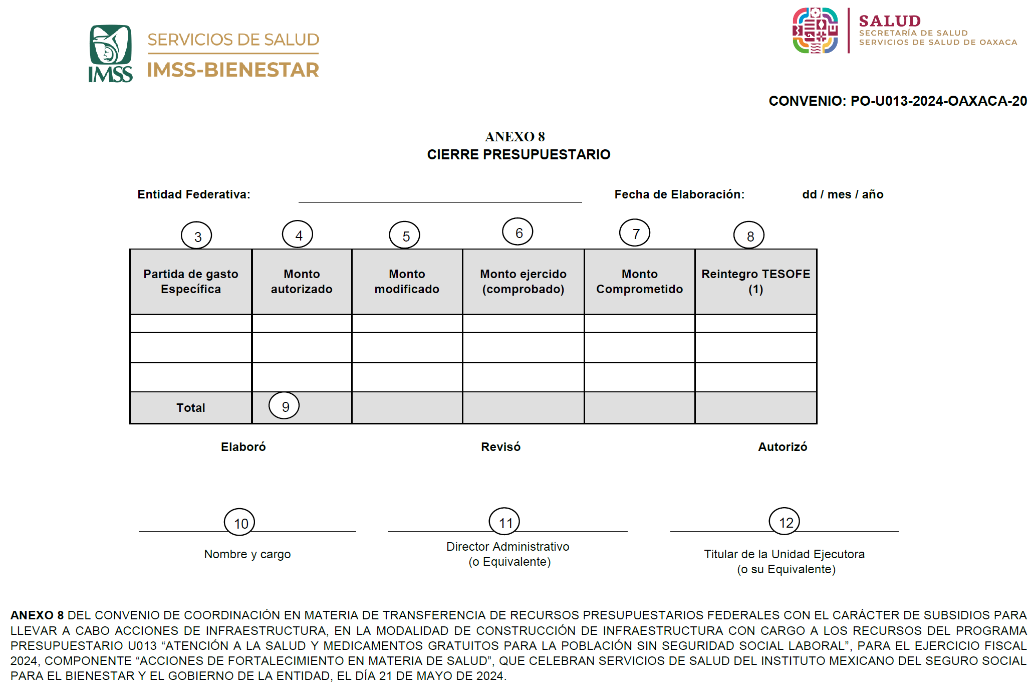 ANEXO 8 DEL CONVENIO DE COORDINACIÓN EN MATERIA DE TRANSFERENCIA DE RECURSOS PRESUPUESTARIOS FEDERALES CON EL CARÁCTER DE SUBSIDIOS PARA LLEVAR A CABO ACCIONES DE INFRAESTRUCTURA, EN LA MODALIDAD DE CONSTRUCCIÓN DE INFRAESTRUCTURA CON CARGO A LOS RECURSOS DEL PROGRAMA PRESUPUESTARIO U013 "ATENCIÓN A LA SALUD Y MEDICAMENTOS GRATUITOS PARA LA POBLACIÓN SIN SEGURIDAD SOCIAL LABORAL", PARA EL EJERCICIO FISCAL 2024, COMPONENTE "ACCIONES DE FORTALECIMIENTO EN MATERIA DE SALUD", QUE CELEBRAN SERVICIOS DE SALUD DEL INSTITUTO MEXICANO DEL SEGURO SOCIAL PARA EL BIENESTAR Y EL GOBIERNO DE LA ENTIDAD, EL DÍA 21 DE MAYO DE 2024.