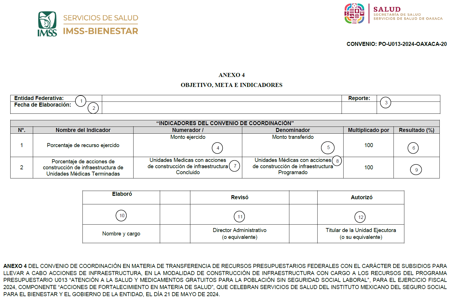 ANEXO 4 DEL CONVENIO DE COORDINACIÓN EN MATERIA DE TRANSFERENCIA DE RECURSOS PRESUPUESTARIOS FEDERALES CON EL CARÁCTER DE SUBSIDIOS PARA LLEVAR A CABO ACCIONES DE INFRAESTRUCTURA, EN LA MODALIDAD DE CONSTRUCCIÓN DE INFRAESTRUCTURA CON CARGO A LOS RECURSOS DEL PROGRAMA U013 "ATENCIÓN A LA SALUD Y MEDICAMENTOS GRATUITOS PARA LA POBLACIÓN SIN SEGURIDAD SOCIAL LABORAL", PARA EL EJERCICIO FISCAL 2024, COMPONENTE "ACCIONES DE FORTALECIMIENTO EN MATERIA DE SALUD", QUE CELEBRAN SERVICIOS DE SALUD DEL INSTITUTO MEXICANO DEL SEGURO SOCIAL PARA EL BIENESTAR Y EL GOBIERNO DE LA ENTIDAD, EL DÍA 21 DE MAYO DE 2024.