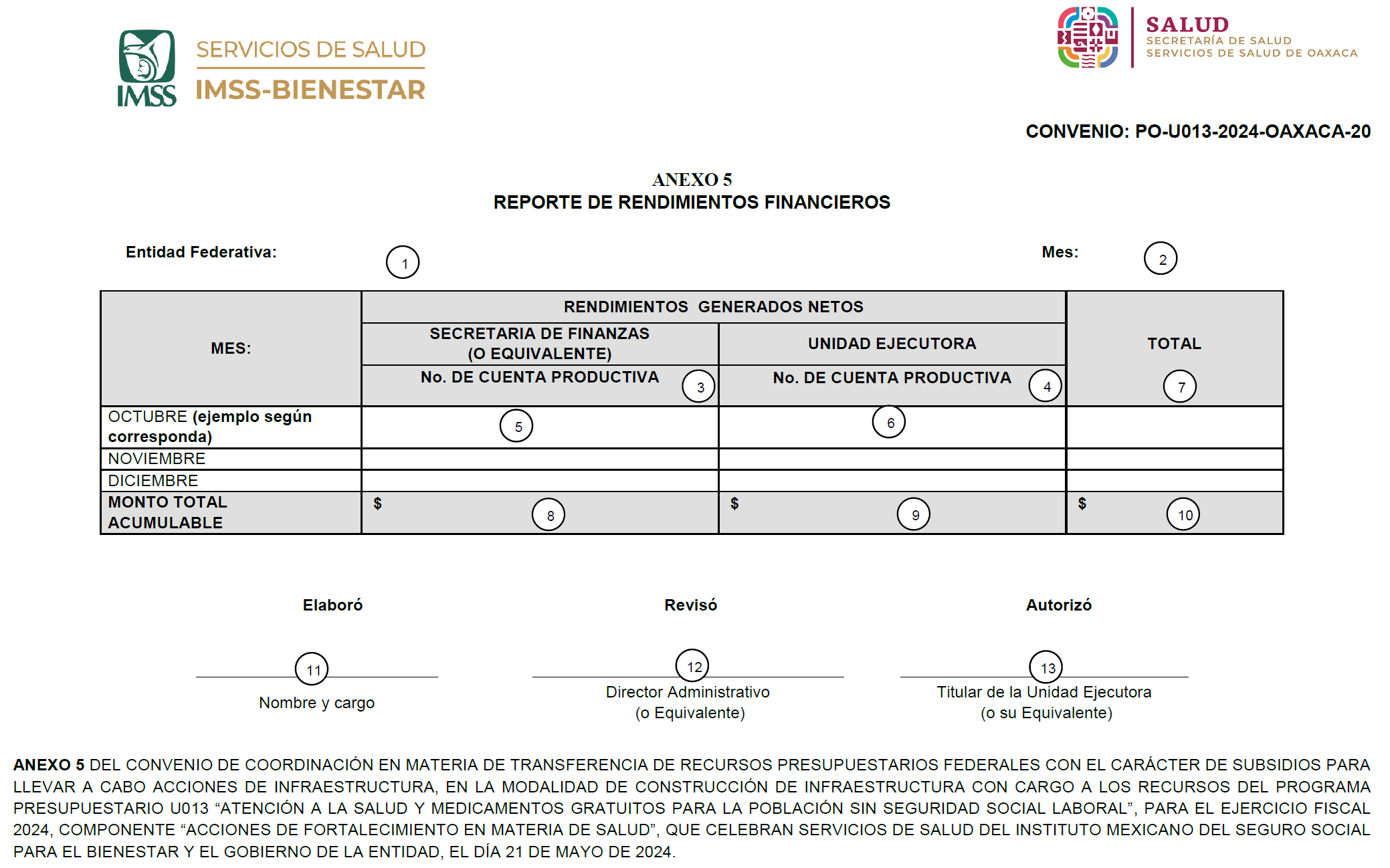 "EL GOBIERNO DE LA ENTIDAD" por conducto de la Unidad Ejecutora presentará mensualmente, dentro de los 15 primeros días naturales de cada mes, un reporte de los rendimientos financieros que generen los recursos presupuestarios federales transferidos en virtud del presente instrumento jurídico, conforme al Anexo 5 de este Convenio de Coordinación.