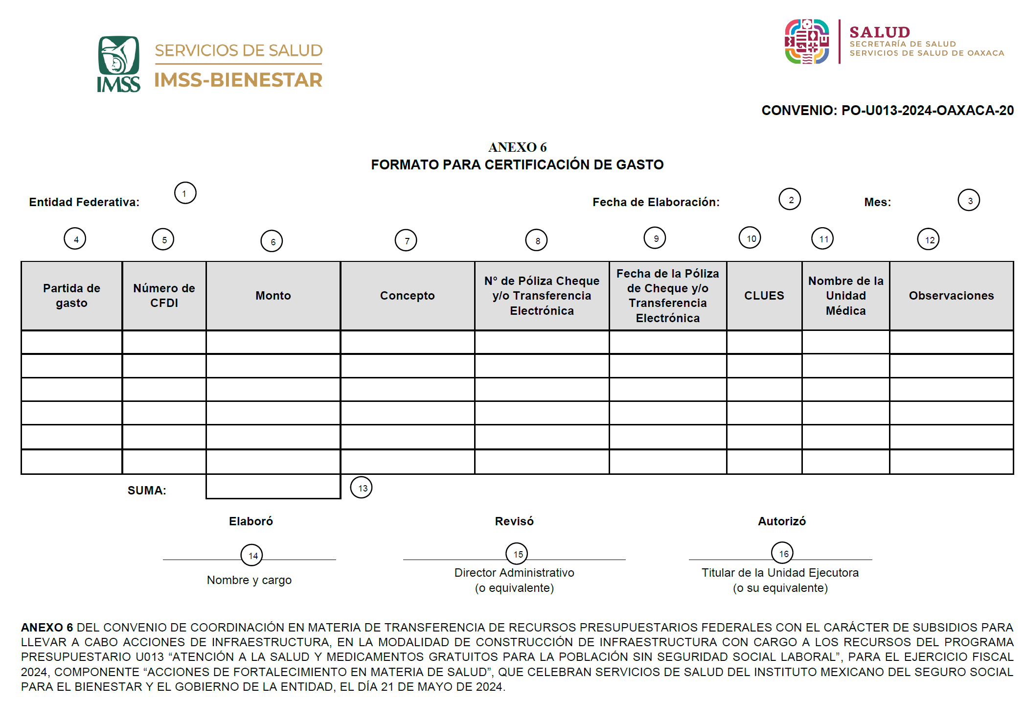ANEXO 6 DEL CONVENIO DE COORDINACIÓN EN MATERIA DE TRANSFERENCIA DE RECURSOS PRESUPUESTARIOS FEDERALES CON EL CARÁCTER DE SUBSIDIOS PARA LLEVAR A CABO ACCIONES DE INFRAESTRUCTURA, EN LA MODALIDAD DE CONSTRUCCIÓN DE INFRAESTRUCTURA CON CARGO A LOS RECURSOS DEL PROGRAMA PRESUPUESTARIO U013 "ATENCIÓN A LA SALUD Y MEDICAMENTOS GRATUITOS PARA LA POBLACIÓN SIN SEGURIDAD SOCIAL LABORAL", PARA EL EJERCICIO FISCAL 2024, COMPONENTE "ACCIONES DE FORTALECIMIENTO EN MATERIA DE SALUD", QUE CELEBRAN SERVICIOS DE SALUD DEL INSTITUTO MEXICANO DEL SEGURO SOCIAL PARA EL BIENESTAR Y EL GOBIERNO DE LA ENTIDAD, EL DÍA 21 DE MAYO DE 2024.