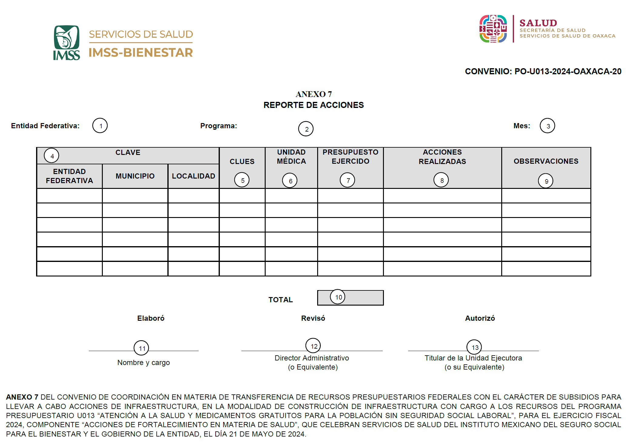 ANEXO 7 DEL CONVENIO DE COORDINACIÓN EN MATERIA DE TRANSFERENCIA DE RECURSOS PRESUPUESTARIOS FEDERALES CON EL CARÁCTER DE SUBSIDIOS PARA LLEVAR A CABO ACCIONES DE INFRAESTRUCTURA, EN LA MODALIDAD DE CONSTRUCCIÓN DE INFRAESTRUCTURA CON CARGO A LOS RECURSOS DEL PROGRAMA PRESUPUESTARIO U013 "ATENCIÓN A LA SALUD Y MEDICAMENTOS GRATUITOS PARA LA POBLACIÓN SIN SEGURIDAD SOCIAL LABORAL", PARA EL EJERCICIO FISCAL 2024, COMPONENTE "ACCIONES DE FORTALECIMIENTO EN MATERIA DE SALUD", QUE CELEBRAN SERVICIOS DE SALUD DEL INSTITUTO MEXICANO DEL SEGURO SOCIAL PARA EL BIENESTAR Y EL GOBIERNO DE LA ENTIDAD, EL DÍA 21 DE MAYO DE 2024.